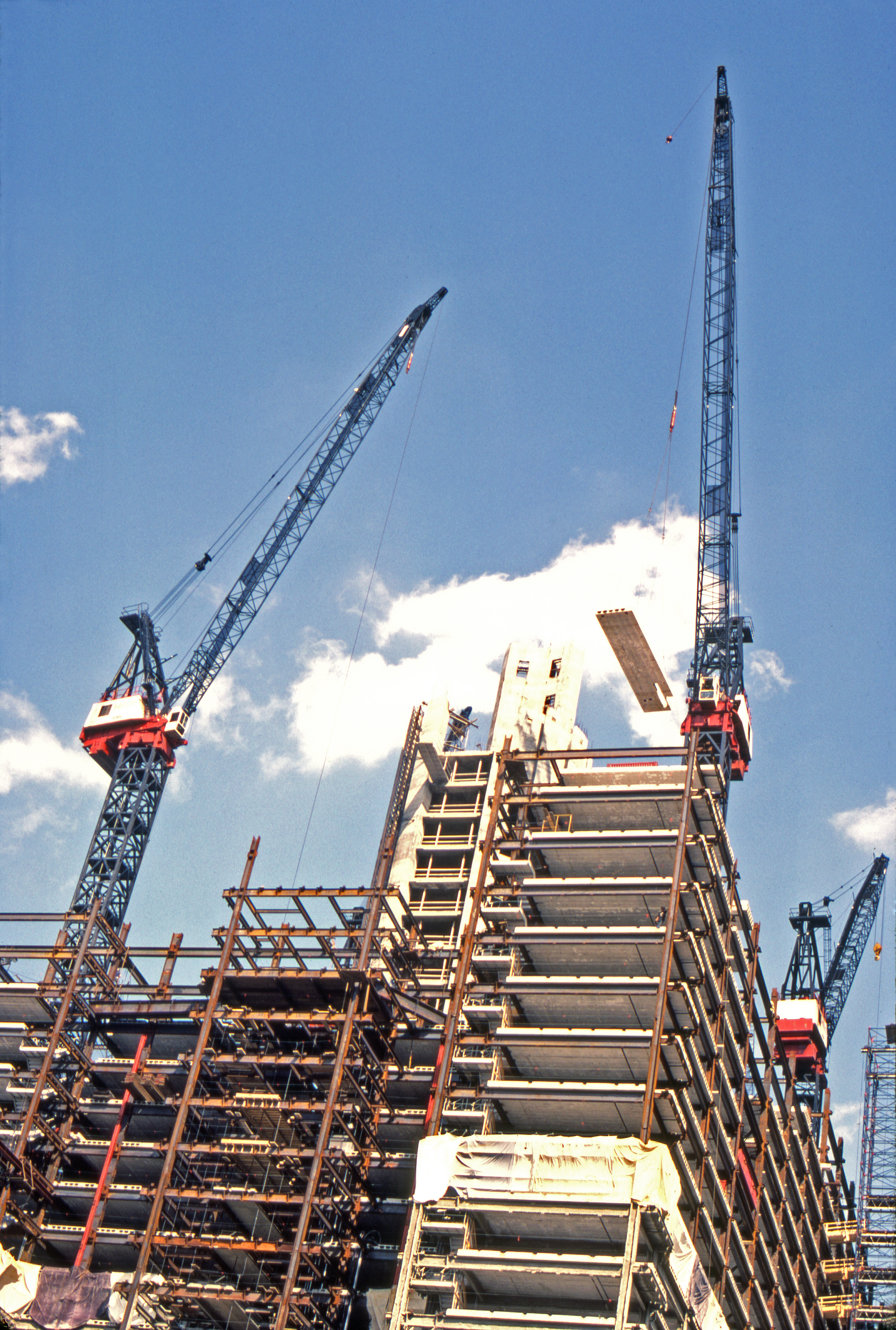 엘리베이터 기둥이 세워진 후, 거대한 강철 구조물이 설치되었다. 높은 교통량과 밀집된 객실 때문에 건설 노동자들을 위한 작업 공간은 좁았고, 건설 장비도 근처에 둘 수 없었다. 철제 빔은 키어니에 있는 공장에서 운송되어 바로 설치되었다. 오후 작업은 주로 건설 현장의 동쪽에서 이루어졌는데, 이는 서쪽에 있는 극장들이 오후 공연 시간이었기 때문이다.[295] 1983년 중반, 노동 인력 부족에 대한 시위가 발생한 후,[438] 개발사는 뉴욕주 도시개발공사의 지침에 따라 추가적으로 소수 노동자들을 고용했고, 몇몇 여성들은 당시 남성 전용 프로젝트에 참여했다.[439]