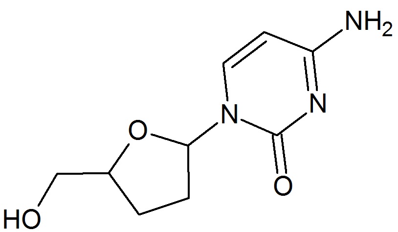 다이디옥시뉴클레오사이드(dideoxynucleoside)는 당 고리에 2'-수산화기(hydroxyl group)와 3'-수산화기가 모두 없는 뉴클레오사이드 유사체이다.[38] 지도부딘이 합성된 지 3년 후, 시카고의 제롬 호르위츠(Jerome Horwitz)와 그의 동료들은 현재 잘시타빈(Zalcitabine, ddC)으로 알려진 또 다른 다이디옥시뉴클레오사이드를 개발했다.[45][16] 잘시타빈은 합성된 피리미딘 뉴클레오사이드 유사체로, 데옥시시티딘과 구조적으로 관련이 있으며 리보스 당의 3'-수산화기가 수소로 치환되어 있다.[46][17] 잘시타빈은 1992년 6월 FDA으로부터 HIV-1 치료 효과를 인정받아 승인되었다.[32][47][3][18]