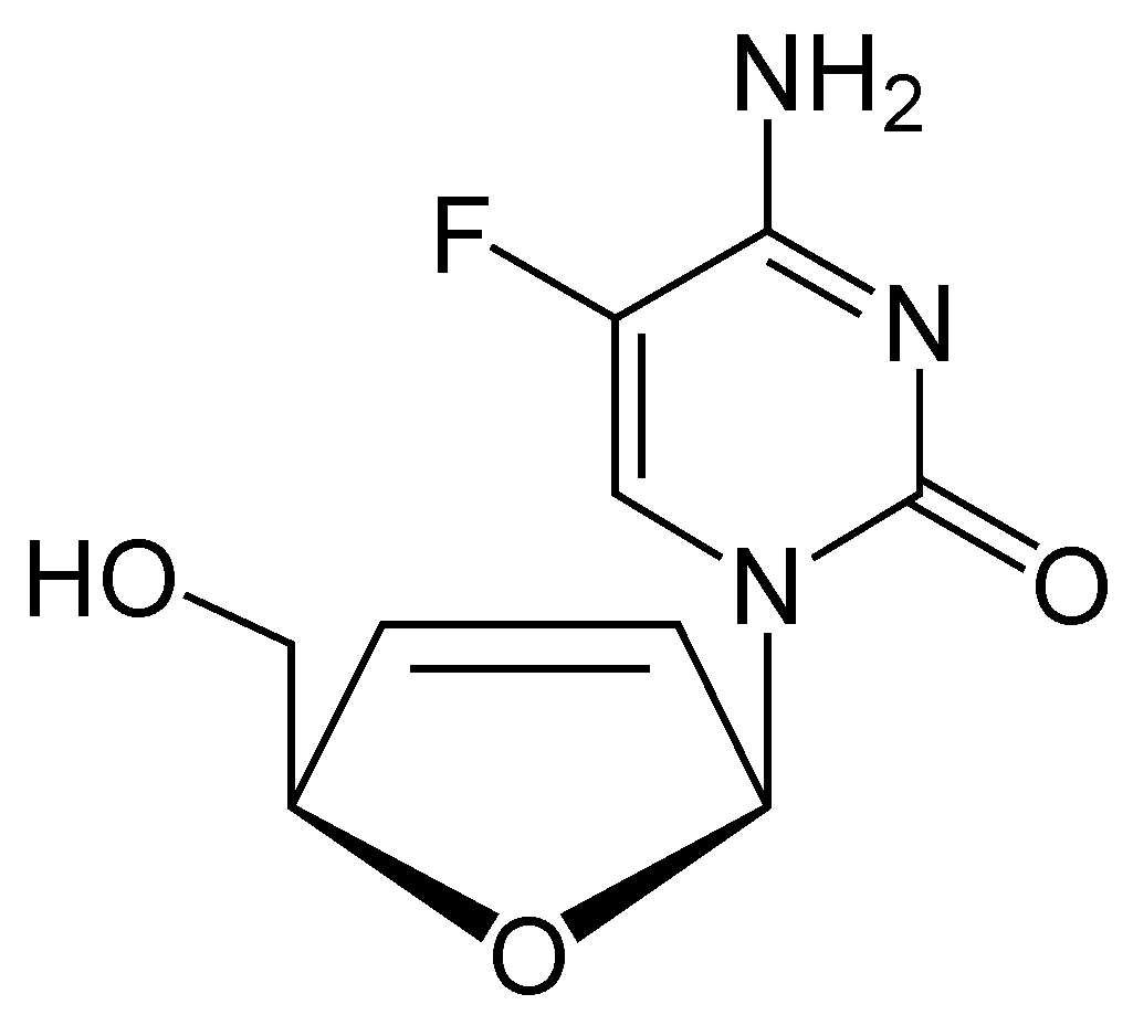 다음으로 2',3'-디데옥시-5-플루오로-3'-티아시티딘(엠트리시타빈, FTC)이 등장했는데, 이는 라미부딘의 구조적 상동계열이다. 구조적 차이점은 라미부딘의 염기 부분에 5-플루오로 변형이 있다는 것이다. 엠트리시타빈은 라미부딘과 여러 면에서 유사하며 HIV-1과 B형 간염 바이러스 모두에 대해 활성이 있다.[21][29]