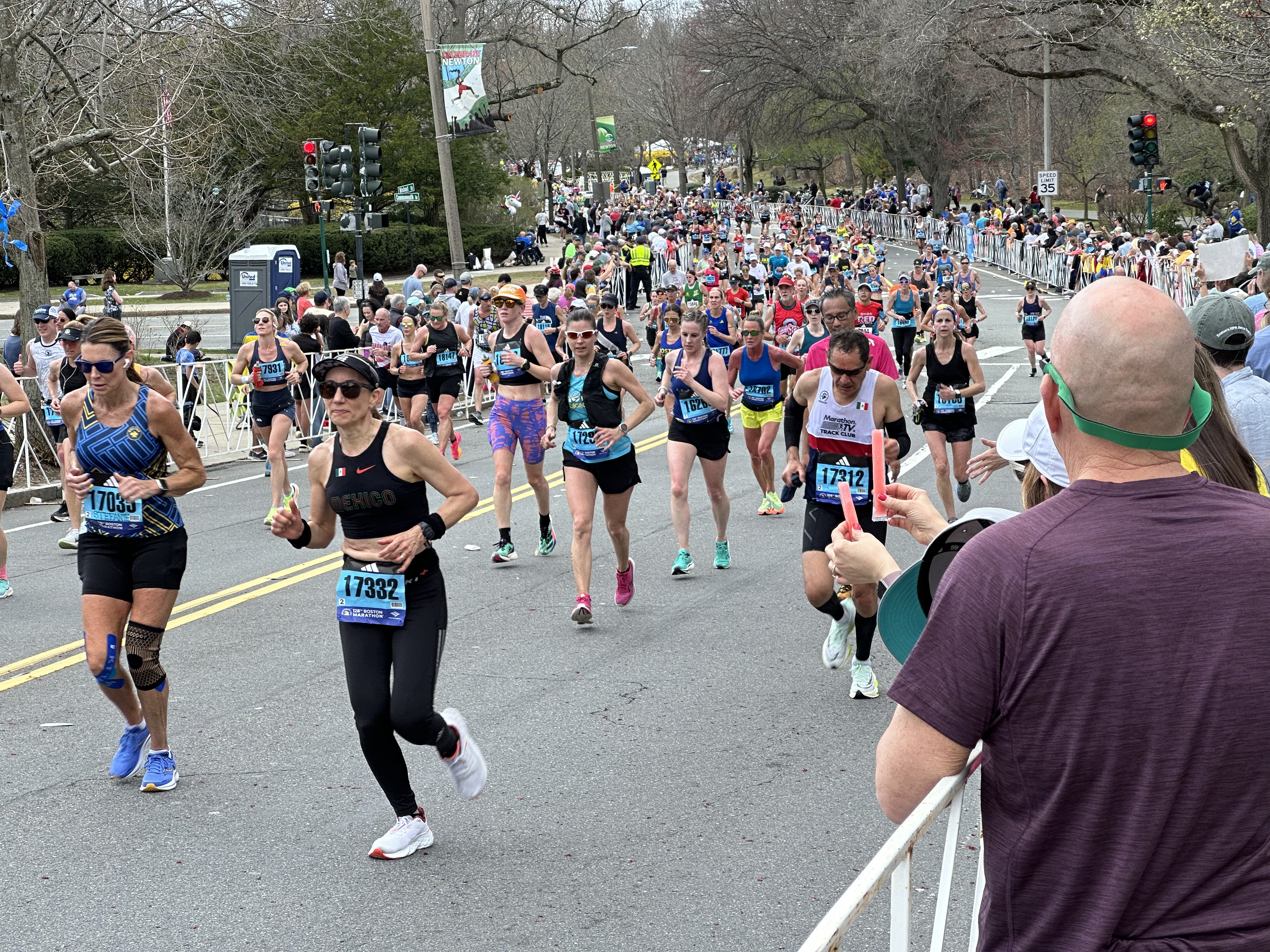 매년 4월 애국자의 날에는 보스턴 마라톤이 이 도시를 통과한다. 선수들은 16번 국도 (워싱턴 스트리트)를 따라 웰즐리에서 들어와 악명 높은 네 개의 '뉴턴 힐' 중 첫 번째 언덕을 마주하게 된다. 그런 다음 30번 국도 (커먼웰스 애비뉴)로 우회전하여 보스턴으로 향한다. 센터 스트리트에 도달하기 전에 두 개의 언덕이 더 있으며, 그 후 센터 스트리트 직후에 네 번째이자 가장 유명한 하트브레이크 힐이 나타난다. 주민들과 방문객들은 워싱턴 스트리트와 커먼웰스 애비뉴를 따라 레이스 경로에 줄지어 서서 선수들을 응원한다.