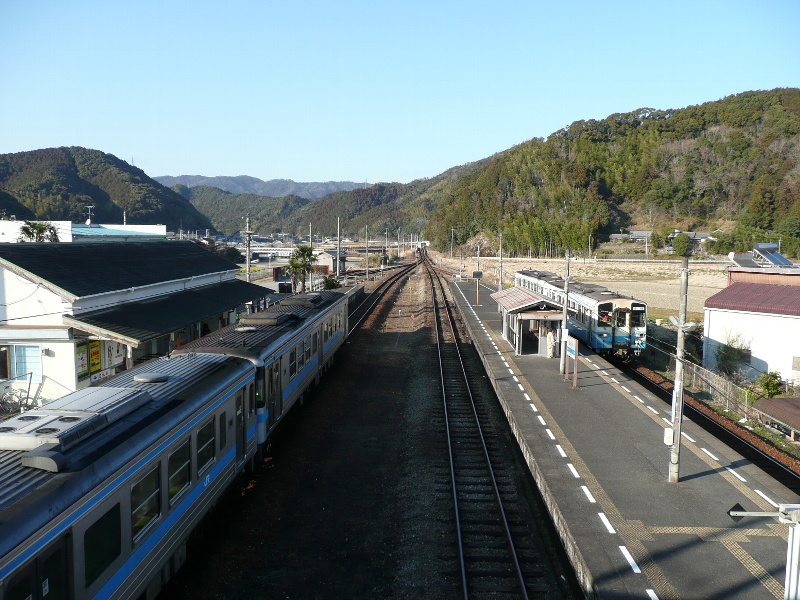 고치역 - 쿠보카와역 간 CTC화 과정에서 1선 스루화되었으며, 1번선이 상행 부본선, 상하 본선, 하행 부본선으로 변경되었다. 2번선은 1선 스루 통과선(제한 100km/h)이다. 마쓰야마 방면 분기역으로 계획되어 1번선과 2번선 사이 간격이 넓다.
