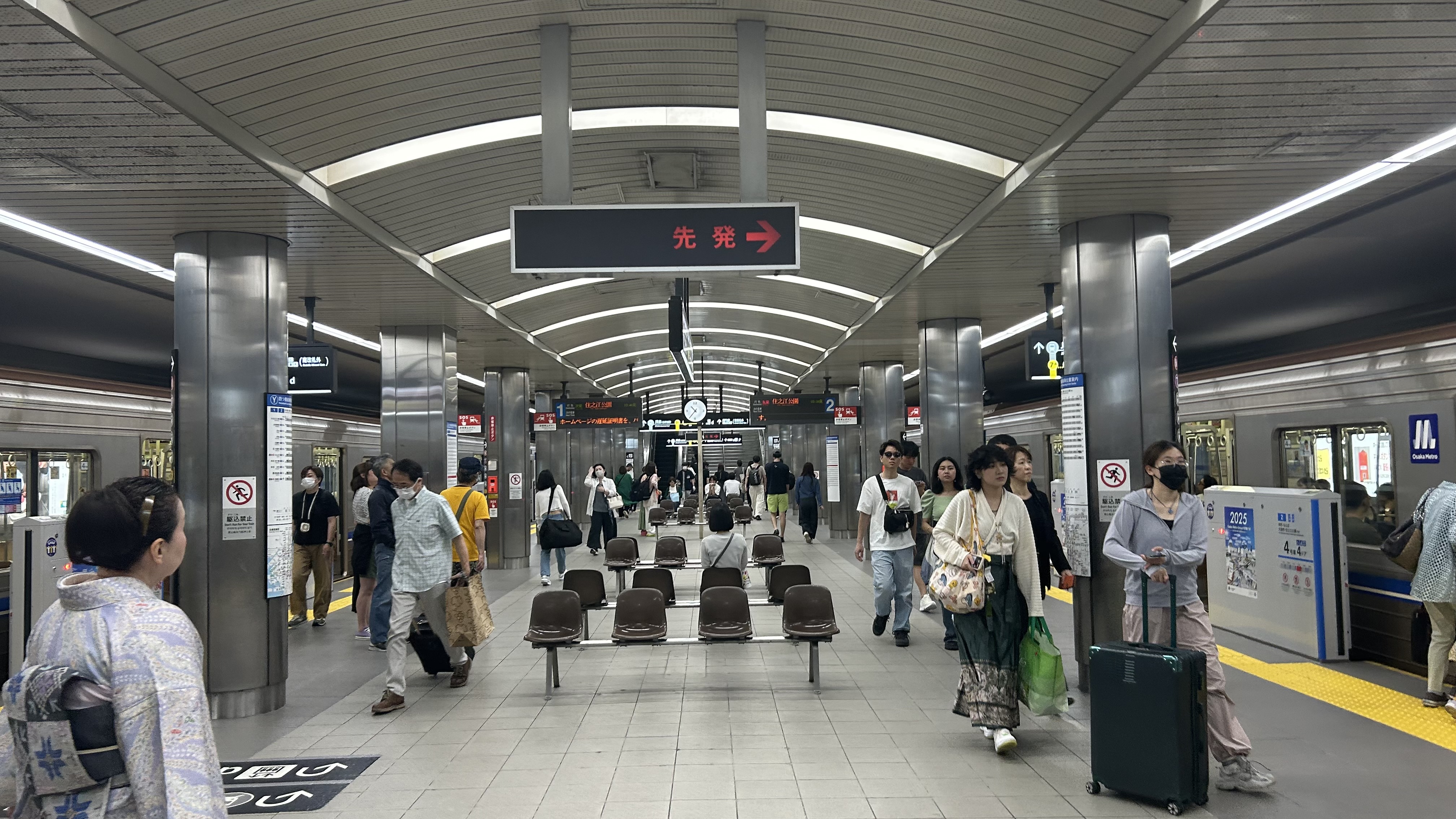 - 새벽과 심야에는 원칙적으로 1번선만 사용하지만, 그 외 시간대에는 번갈아 가며 발착한다. 어느 쪽이 먼저 출발하는지 바로 알 수 있도록 중앙 개찰구(B계단)와 C계단에서 내린 곳에 각각 「←선발」 또는 「선발→」이 점등하는 행등식 표시기가 설치되어 있다.[4]