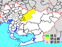 범례 | 1: 고로모정 2: 쓰치하라정 3: 후지오카정 4: 미야자키촌 5: 가미시게촌 6: 시모야마촌 파랑: 도요타시 빨강: 현재 도요타시에 속하는 구 니시카모군 구역 |