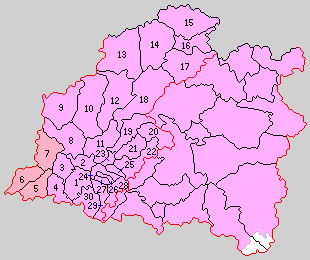 도요타시의 일부 (고로모 지구, 다카하시 지구, 사나게 지구, 호미 지구, 이시노 지구, 후지오카 지구, 오바라 지구, 대자)