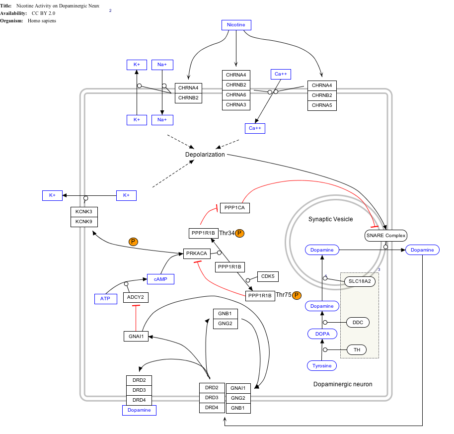 니코틴은 뇌의 니코틴성 아세틸콜린 수용체에 결합하여 정신 활성 효과를 유발하고 여러 신경 전달 물질의 수준을 증가시켜 일종의 "볼륨 조절" 역할을 한다.[131][132]니코틴은 복측 피개 영역(VTA)에 분포하는 뉴런과 중변연계 경로 내의 뉴런에서 니코틴 수용체(특히 α4β2 니코틴성 수용체 및 α5 nAChRs)를 활성화하여 도파민의 방출을 유발하는 것으로 보인다.[139][140] 이러한 니코틴 유도 도파민 방출은 적어도 부분적으로 복측 피개 영역에서 콜린성-도파민성 보상 연결의 활성화를 통해 발생한다.[140][141]