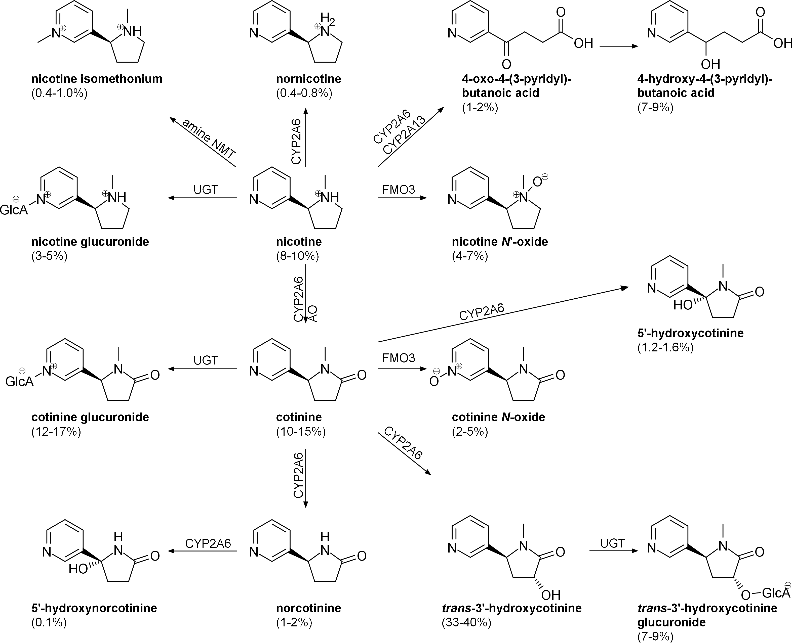 다른 주요 대사산물에는 니코틴 ''N''-옥사이드, 노르니코틴, 니코틴 이소메토늄 이온, 2-히드록시니코틴 및 니코틴 글루쿠로나이드가 있다.[152] 멘톨 담배의 첨가제인 멘톨은 니코틴의 글루쿠론산 결합 및 산화 대사를 억제하여 ''생체 내'' 니코틴의 반감기를 증가시킨다.[155]