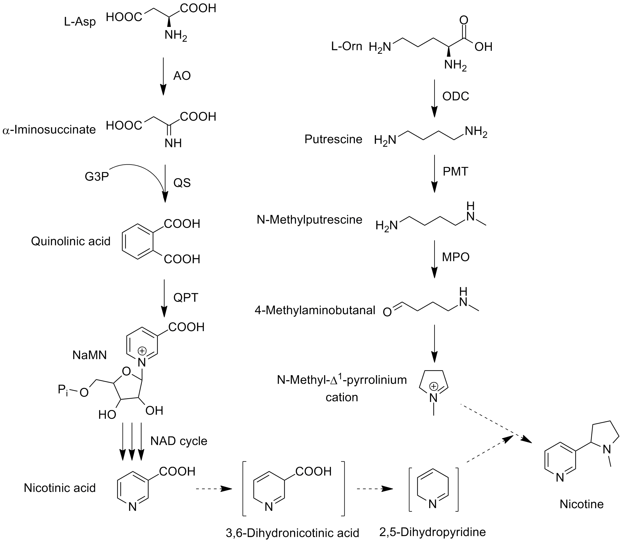 니아신과 ''N''-메틸-Δ1-피롤리디움 양이온이 결합하여 니코틴이 합성되는데, 이 과정은 아직 명확하게 밝혀지지 않았다. 현재까지 알려진 이론에 따르면, 니아신은 3,6-디히드로니코틴산을 거쳐 2,5-디히드로피리딘으로 전환된 후, ''N''-메틸-Δ1-피롤리디움 양이온과 반응하여 거울상 이성질체적으로 순수한 (−)-니코틴을 형성한다.[170]