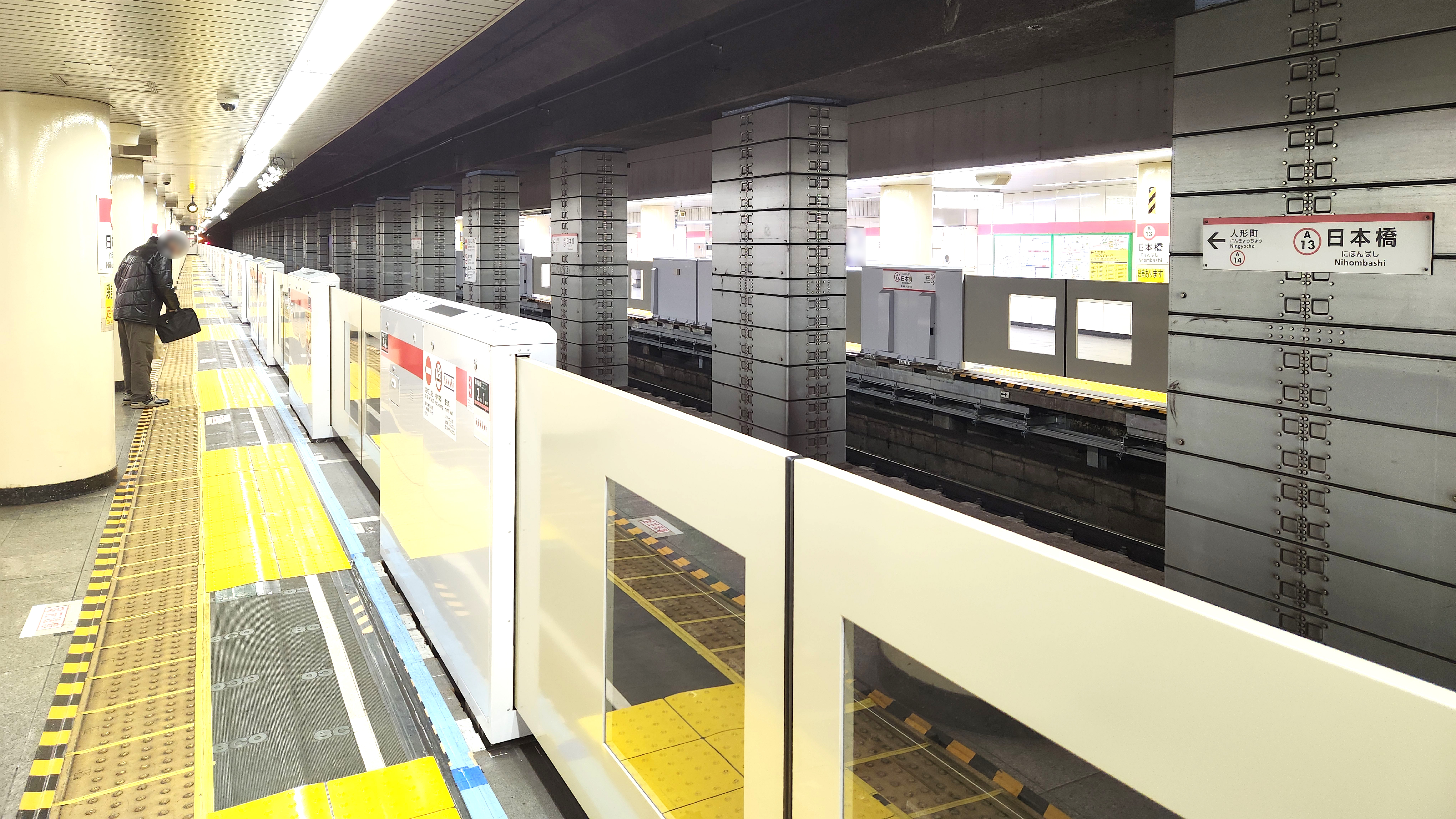 도쿄 메트로 긴자선은 중앙가와 에이타이도리가 교차하는 "니혼바시 교차로"의 중앙가 바로 밑 지하 2층에 있는 2면 2선의 상대식 지하역이다. 1932년 12월 24일 개업 초기에는 섬식 승강장 (1면 2선)이었지만, 승객 증가에 따라 1984년에 시부야 방면 승강장을 증설했다.도자이선은 니혼바시 교차로의 에이타이도리 바로 밑 지하 3층에 섬식 승강장 1면 2선을 갖춘 지하역이다. 가야바초 쪽에 에도바시 1초메 교차로 방면 개찰구가 있으며, 도에이 아사쿠사선과 연결되는 통로로 이어진다. 승강장 중앙, 오테마치 쪽 계단 중간에는 역 사무실이 있다.