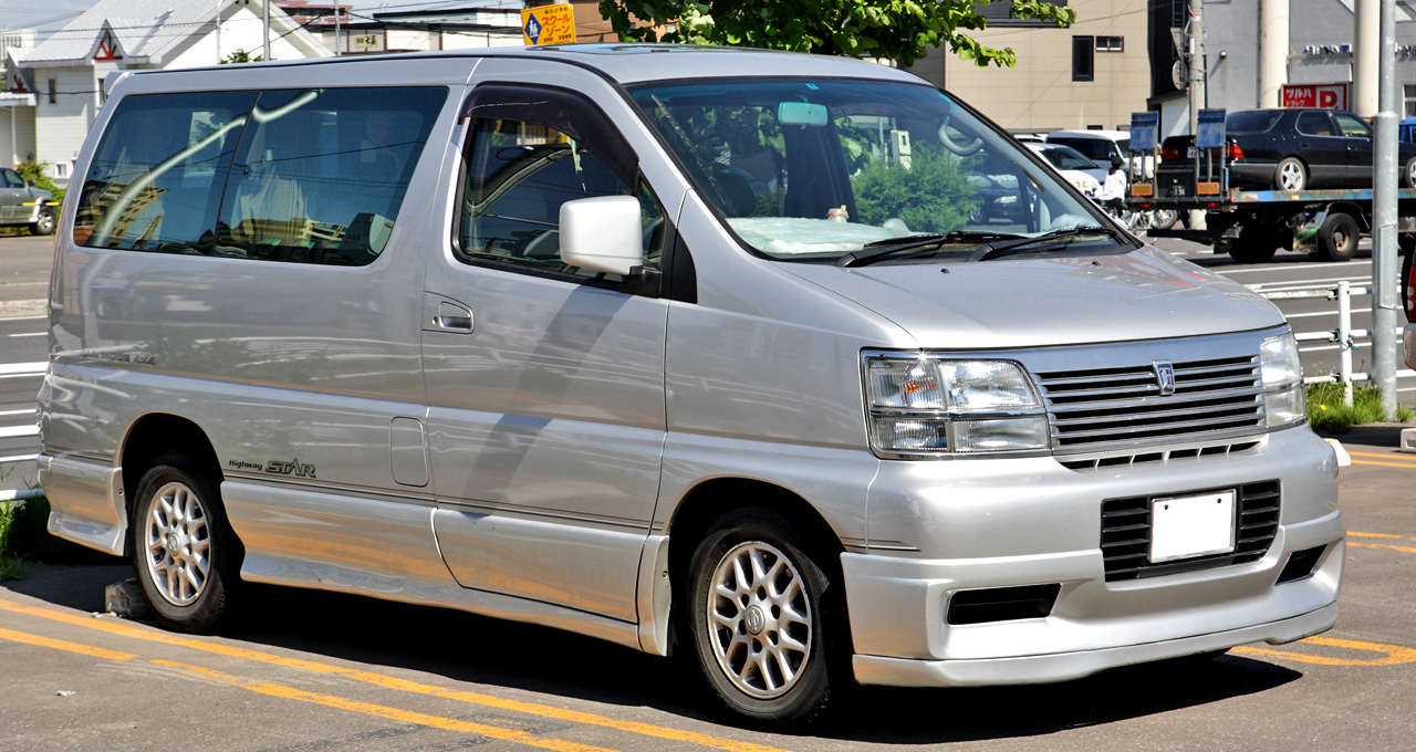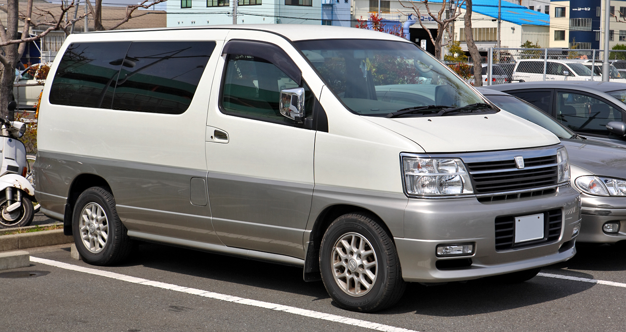 닛산 엘그란드의 1세대는 1997년 5월부터 2002년 5월까지 생산되었으며, 상업용 모델은 2017년 12월까지 생산되었다. 가솔린 VG33E, VQ35DE 및 디젤 QD32ETi 및 ZD30DDTi를 포함한 다양한 엔진 조합을 사용할 수 있었다.[1] E50은 4단 자동변속기를 탑재했으며, 2륜 또는 4륜 구동으로 제공되었다. 카라반 엘그란드는 ''닛산 스토어'' 전용이었고, 호미 엘그란드는 일본 ''닛산 프린스 스토어'' 딜러 전용이었다. 엘그란드는 카라반 코치의 승객 운송 역할을 고급화하여 이어받았다. 최고 트림 레벨의 장비 패키지에는 CarWings라는 인터넷 지원 위성 내비게이션이 설치되었다.