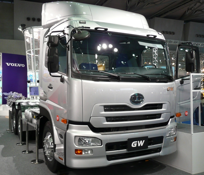 2004년 11월 18일, 닛산 디젤 빅섬의 후속 모델로 일본에서 출시되었다. 대형 트럭 세계 최초로 SRS 무릎 에어백 및 무릎 보호대를 채택하고, 라운드 캡을 적용했다.[25] 2005년 6월에는 제설차 및 트랙터 모델이 추가되었다.2005년 10월 3일에는 굿 디자인 상을 수상했다.[25] 2006년 2월에는 2005년 닛케이 우수 제품 서비스상을 수상했다.