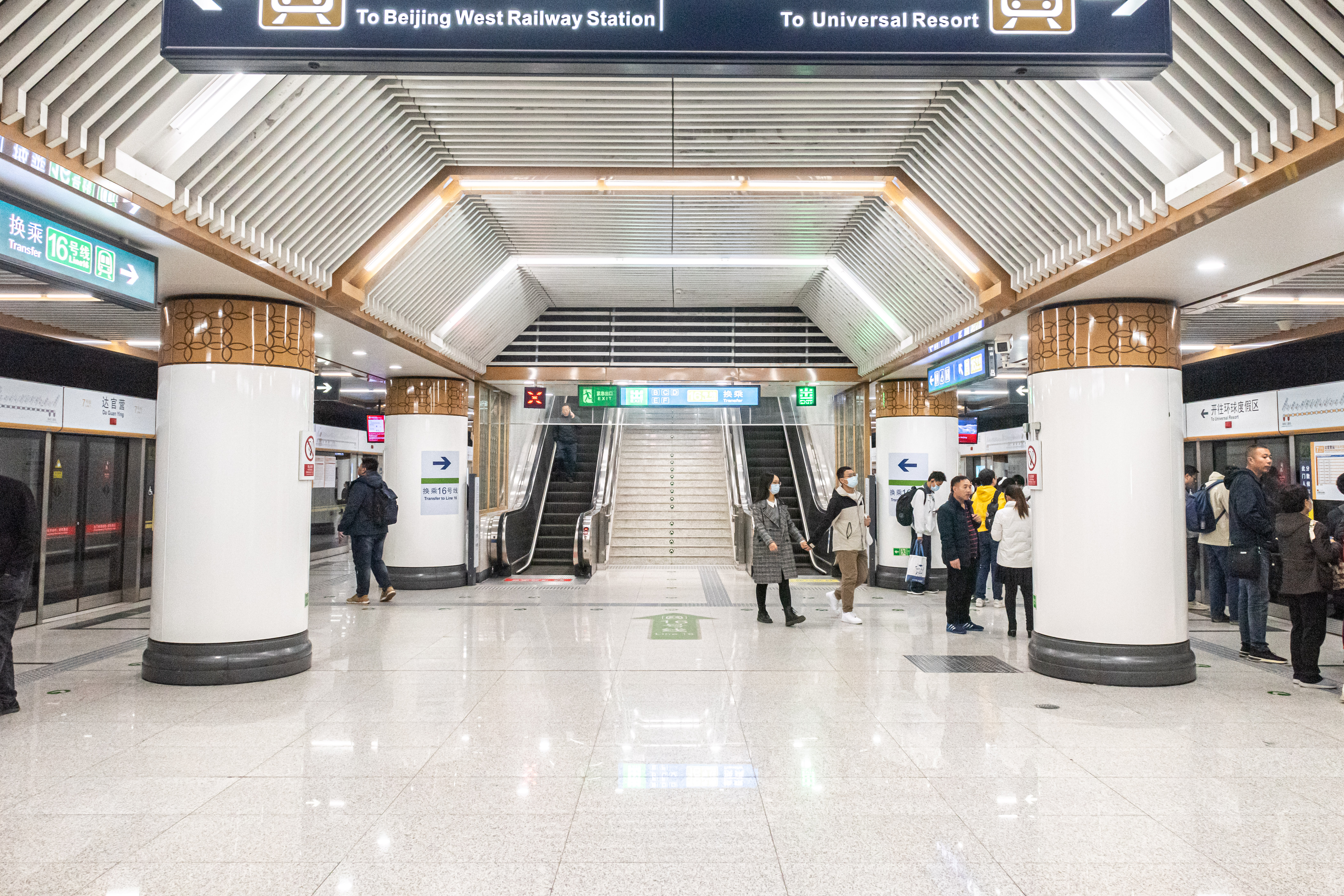 베이징 지하철 7호선과 베이징 지하철 16호선은 모두 지하 섬식 승강장 구조를 갖추고 있다. 7호선 역사는 1면 2선 섬식 승강장이며, 16호선 역사는 승강장 폭 14m의 섬식 승강장으로 설계되었다. 두 노선은 대합실을 연결하는 환승 통로를 통해 환승할 수 있다.[7]