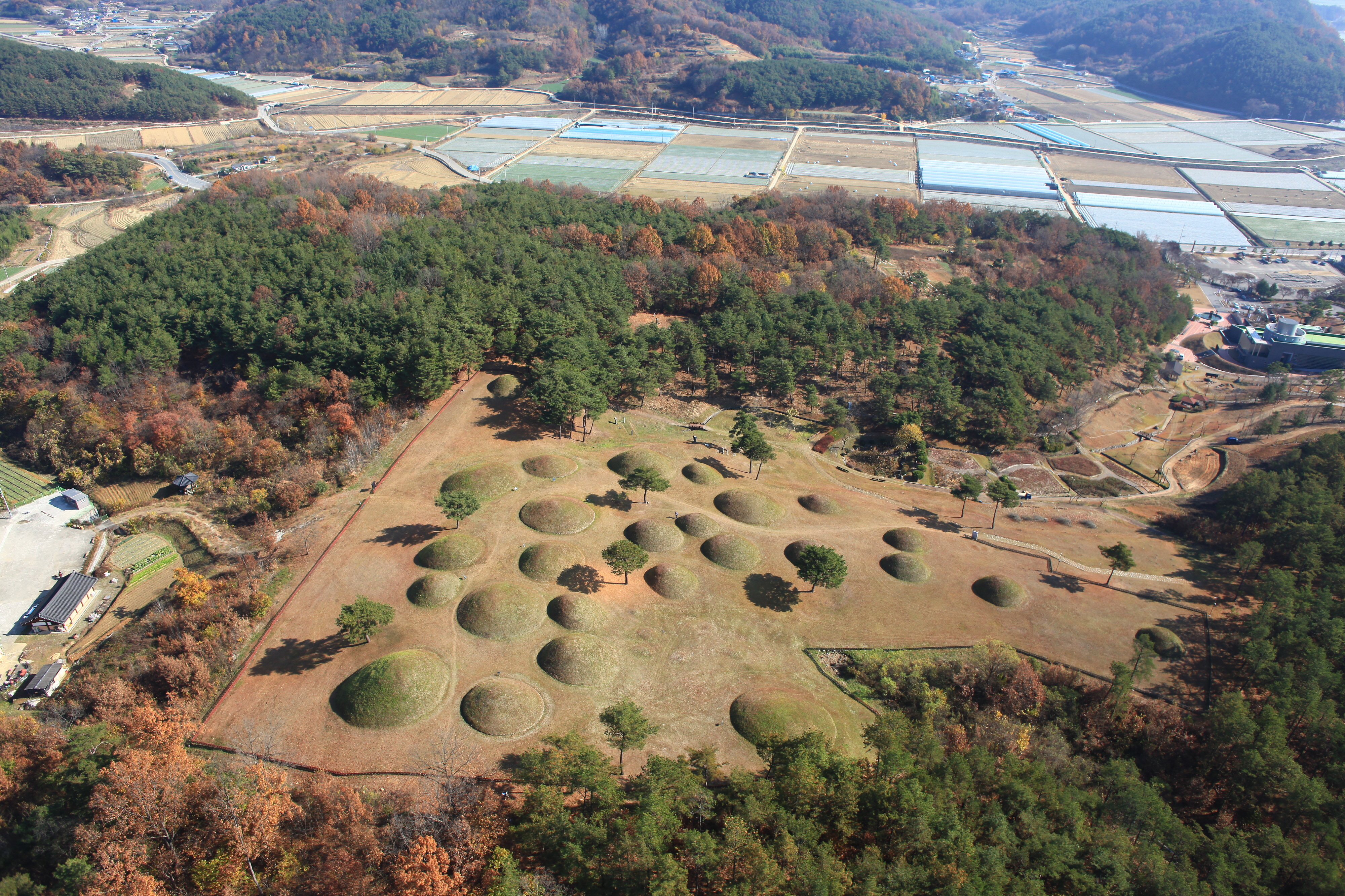 합천 옥전 고분군경상남도 합천군에 있는 고대 묘역으로, 다라국의 지배층이 묻힌 곳으로 추정된다. 황강낙동강과 합류하기 직전 황강을 따라 조성되어 있으며, 고분의 크기와 구조, 출토된 유물들을 통해 다라국의 정치적, 군사적 위상을 짐작할 수 있다. 가야 특유의 토기와 함께 5세기부터 6세기 중반에 이르기까지 대가야, 신라와의 교류를 보여주는 다양한 유물들이 발견되었다. 거대한 고총을 중심으로 대형 고분과 중소형 고분들이 밀집해 있는데, 23호분과 35호분은 다라국의 성립과 전성기를 대표하는 고분이다.[3]