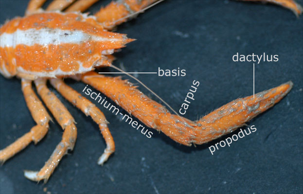 - 갑각류(Crustacea): 다리가 두 갈래로 갈라지는 '이분지' 형태가 특징이다. 바깥쪽 가지는 '''외지'''(겉다리), 안쪽 가지는 '''내지'''(속다리)라고 부른다. 다리 마디는 기절(밑마디), 원절(도래마디), 좌절, 장절, 완절(발목마디), 전절(앞마디), 지절(가락마디)로 총 7개이다. 게나 가재의 집게발은 전절의 부속이 지절과 관절을 이루어 만들어진다.