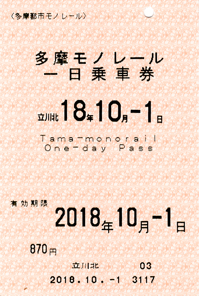 하루 동안 전 구간을 자유롭게 이용할 수 있는 승차권이다. 2019년 10월 1일에 가격이 890JPY으로 개정되었다.[13] 모든 역의 자동판매기에서 구매할 수 있다. 어린이는 반액이지만, 2022년 4월부터 5월까지는 어린이 전용 '다마모노코도모 원데이 패스'가 100JPY에 판매되었다.