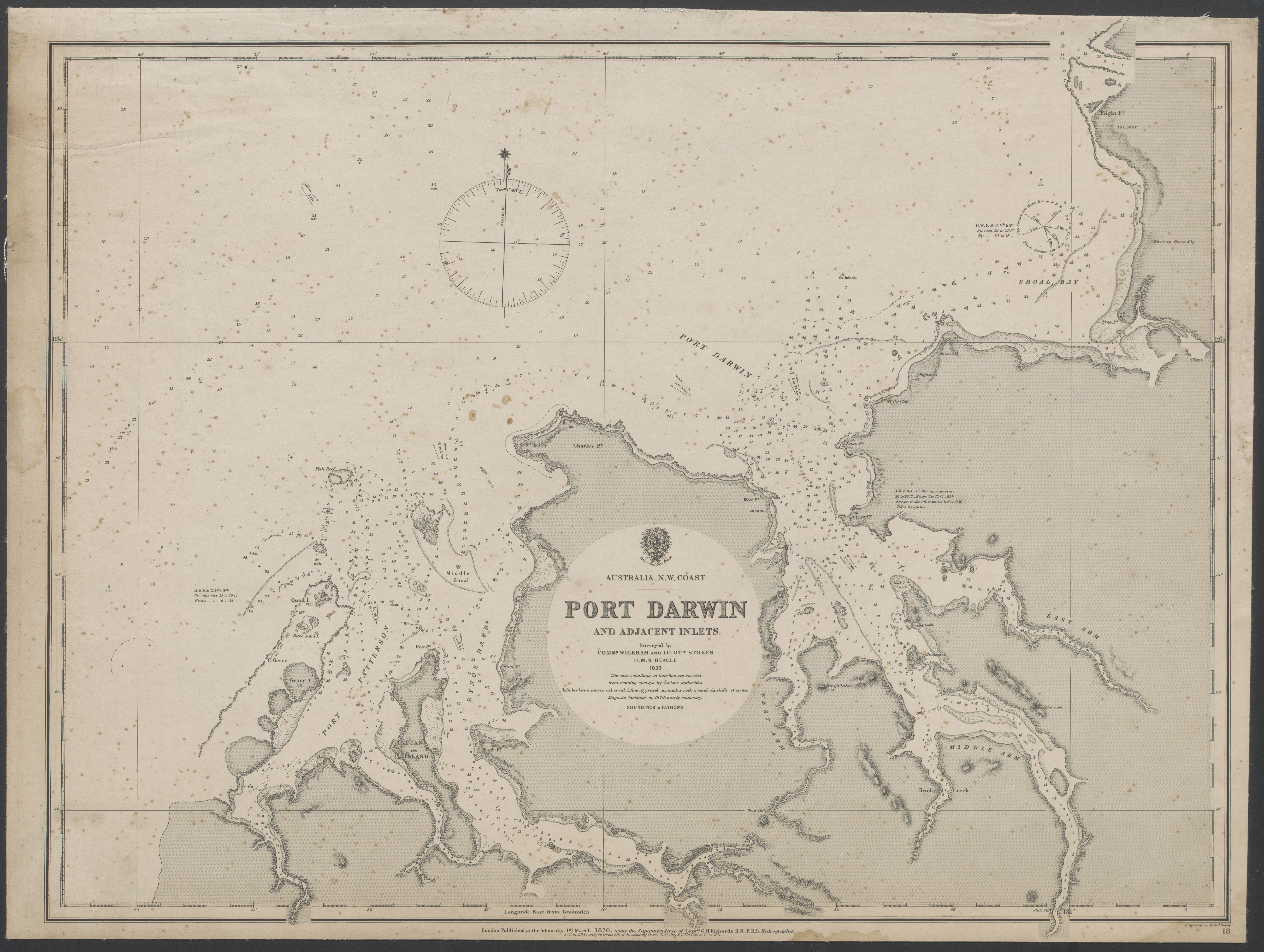 1839년 9월 9일, 비글호의 중위였던 존 로트 스토크스가 다윈 항구를 처음 본 영국인으로 보인다. 함장인 존 클레멘츠 위컴은 이전 비글호의 두 번째 탐험에서 1등 항해사로 근무했던 그와 함께 항해했던 영국의 박물학자 찰스 다윈의 이름을 따서 항구의 이름을 지었다.[18]