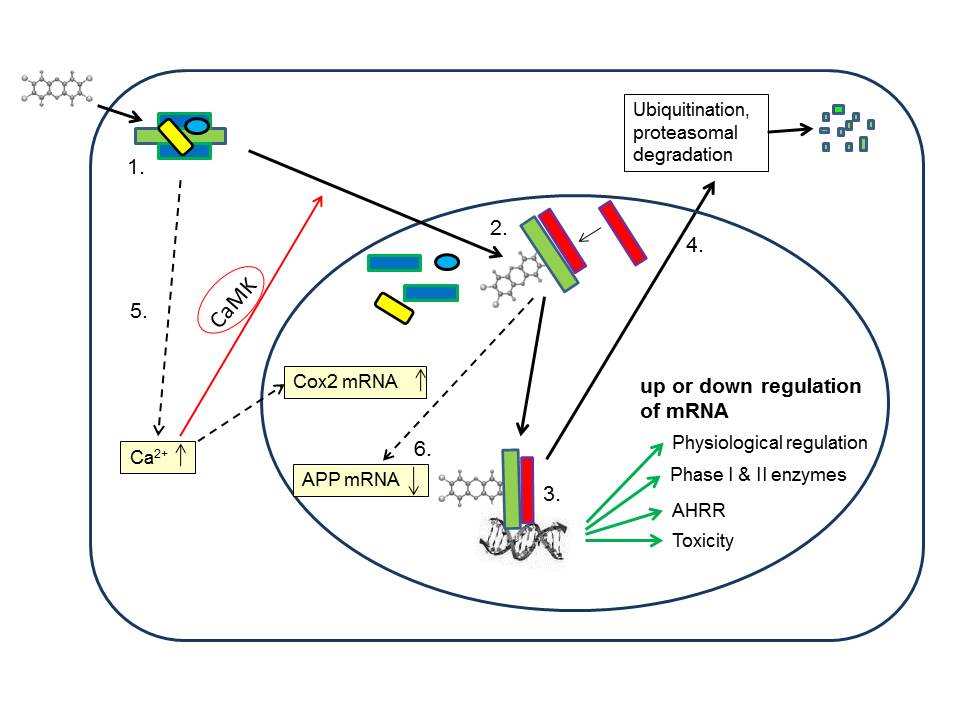 AH 수용체는 이물질 대사에 중요한 여러 효소를 유도한다. 여기에는 산화적 1상 효소와 접합 2상 효소(예: CYP1A2, CYP1B1, CYP2S1, CYP2A5, ALDH3, GSTA1, UGT1A1, UGT1A6, UGT1A7 및 NQO1)가 포함된다.[16] 이는 이물질의 독성/발암성 효과를 예방하는 보호 기능이지만, 경우에 따라 돌연변이 유발 및 발암성 반응성 대사 산물 생성을 유발할 수 있다. 이러한 효소 유도는 발암성 다환 탄화수소인 벤조''(a)''피렌,[16] 여러 천연 화합물,[9] 및 다이옥신에 의해 시작될 수 있다.[1] AH 수용체는 고용량 다이옥신의 독성 효과를 유발하는 유전자 활성화/침묵에 관여한다.[1] TCDD는 고용량에서 수백 개 유전자 전사에 영향을 줄 수 있어, 다이옥신의 수많은 독성 효과에 중요한 유전자는 아직 명확히 밝혀지지 않았다.[17]