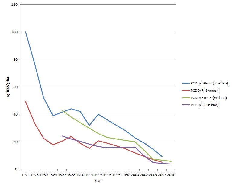 한국인의 다이옥신 섭취량은 다른 선진국과 비슷한 수준이며, 특히 어패류 섭취가 중요한 노출원이다.[137] 1997년 조사에 따르면, 일본인의 1일 다이옥신 섭취량은 다음과 같다.