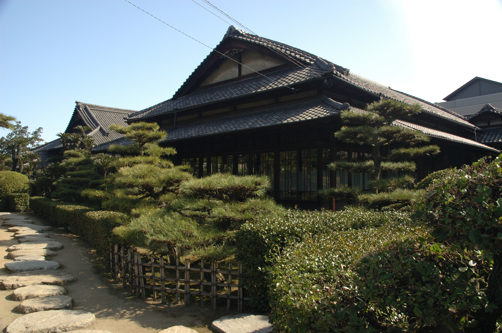 - 본관: 건축 면적 1,916㎡의 대규모 일본식 목조 건축 (일부 2층). 현관, 소철의 방, 대서원, 槙의 방, 소나무의 방, 오동나무의 방, 삼나무의 방 등 여러 방을 복도로 연결, 크고 작은 중정을 설치한 복잡한 평면 구성. 다이쇼 시대의 대규모이면서도 본격적인 목조 주택 건축으로 귀중하다.[34]