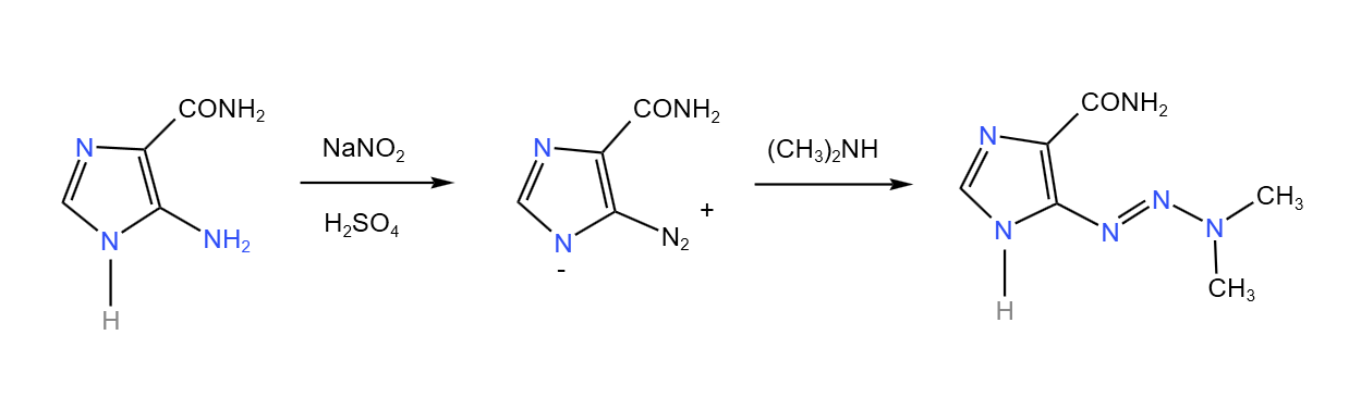 5-아미노이미다졸-4-카복사마이드에 아질산을 첨가하면 5-다이아조이미다졸-4-카복사마이드가 생성된다. 이를 다이메틸아민과 반응시키면 다카바진이 생성된다.[30][15]
