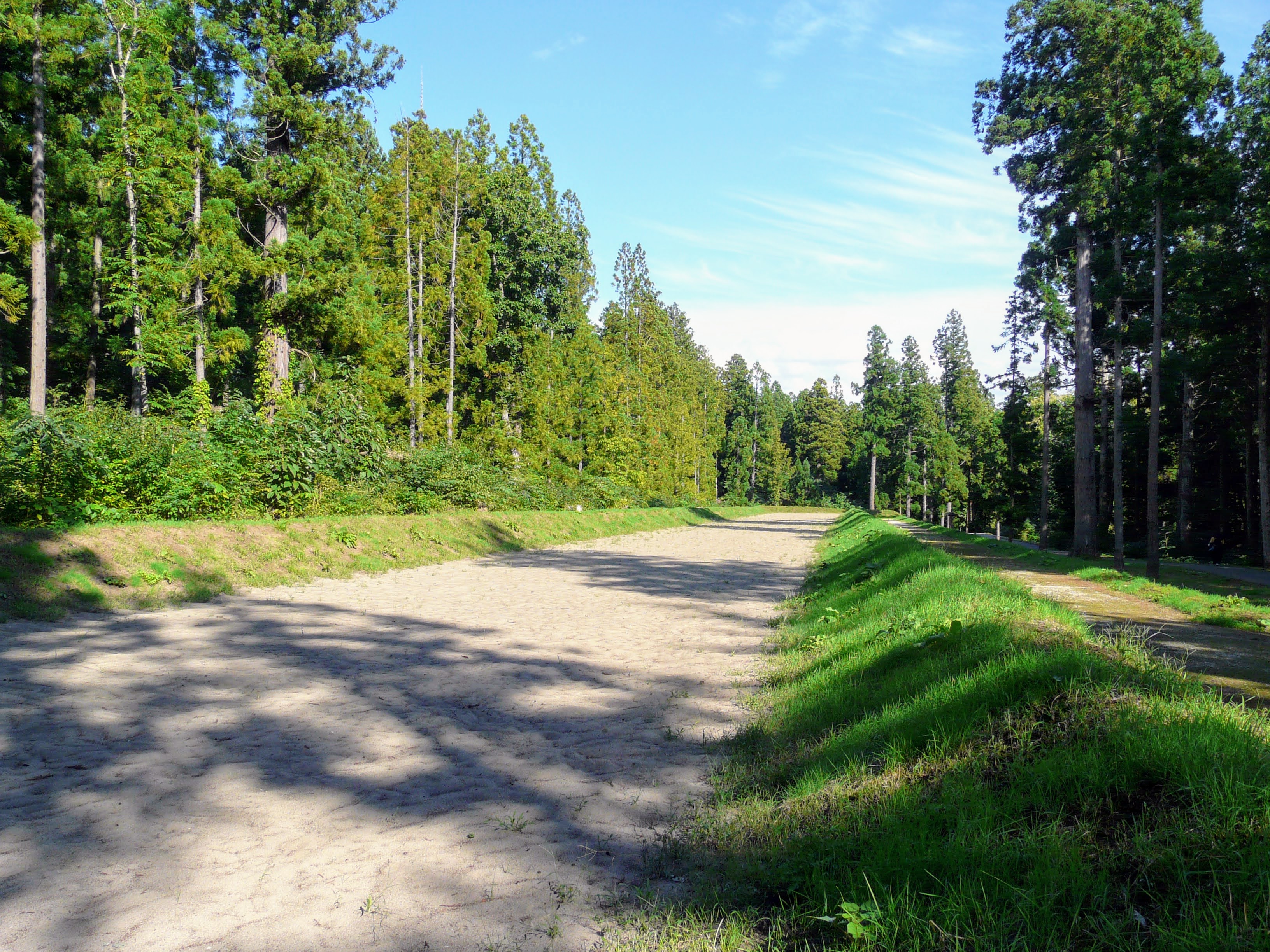 경내 및 참도(다카오카 가도)는 동서 축선상에 일직선으로 배치되어 있다.[3][10] 동쪽에서 서쪽으로 1의 도리이, 즈이신몬, 배전・폐전, 동헌랑, 중문, 서헌랑, 본전 순으로 이어지며, 본전 뒤쪽 서쪽 약 200m에 노부마사 묘소가 있다. 다카오카 가도는 효쿠자와 사(현 이와키 산 신사)로 가는 참도인 효쿠자와 가도에서 분기되어 약 400m가 일직선으로 뻗어 있으며, 다카오카 가도에서 묘소까지 약 800m 거리가 동서선 축상에 일직선으로 정렬되어 있다. 다카오카 가도에는 소나무 가로수가 심어져 있으며, 효쿠자와 가도의 소나무 가로수와 함께 현 지정 천연기념물이다.[50]