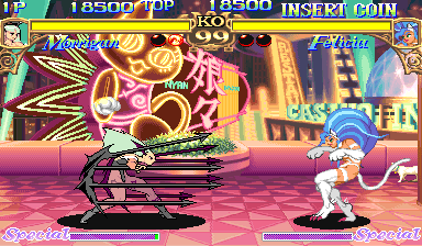 이 게임은 캡콤이 ''스트리트 파이터 II'' 시리즈를 위해 개발한 게임 플레이 시스템을 사용하지만, 에어 블로킹, 크라우치 워킹, 체인 콤보와 같은 몇 가지 새로운 게임 플레이 기능을 추가했다. 이 게임은 ''슈퍼 스트리트 파이터 II 터보''의 슈퍼 콤보 게이지와 유사한 스페셜 미터를 특징으로 하여 플레이어가 이전의 슈퍼 터보와 매우 유사한 고유한 "콤보" 유형의 기술 (''다크스토커즈'' 시리즈에서는 "ES"라고 불림)을 수행하거나, 자신의 스페셜 중 하나의 파워 업된 버전 ( "EX"라고 불리며, 이후 ''다크스토커즈'' 게임과 ''스트리트 파이터 III''에도 등장할 개념)을 수행할 수 있었다. 슈퍼 터보의 슈퍼 콤보 게이지와 달리, ''다크스토커즈''의 스페셜은 플레이어가 슈퍼 기술을 수행하지 않으면 점차 소모되어 플레이어가 슈퍼 기술을 나중에 사용하기 위해 보존하는 것을 방지한다.2. 2. 등장 캐릭터