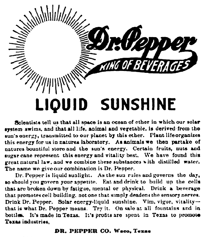 이 청량 음료의 초기 광고는 "소화를 돕고 활력과 활력을 회복시킨다"는 의학적 주장을 했다.[11]