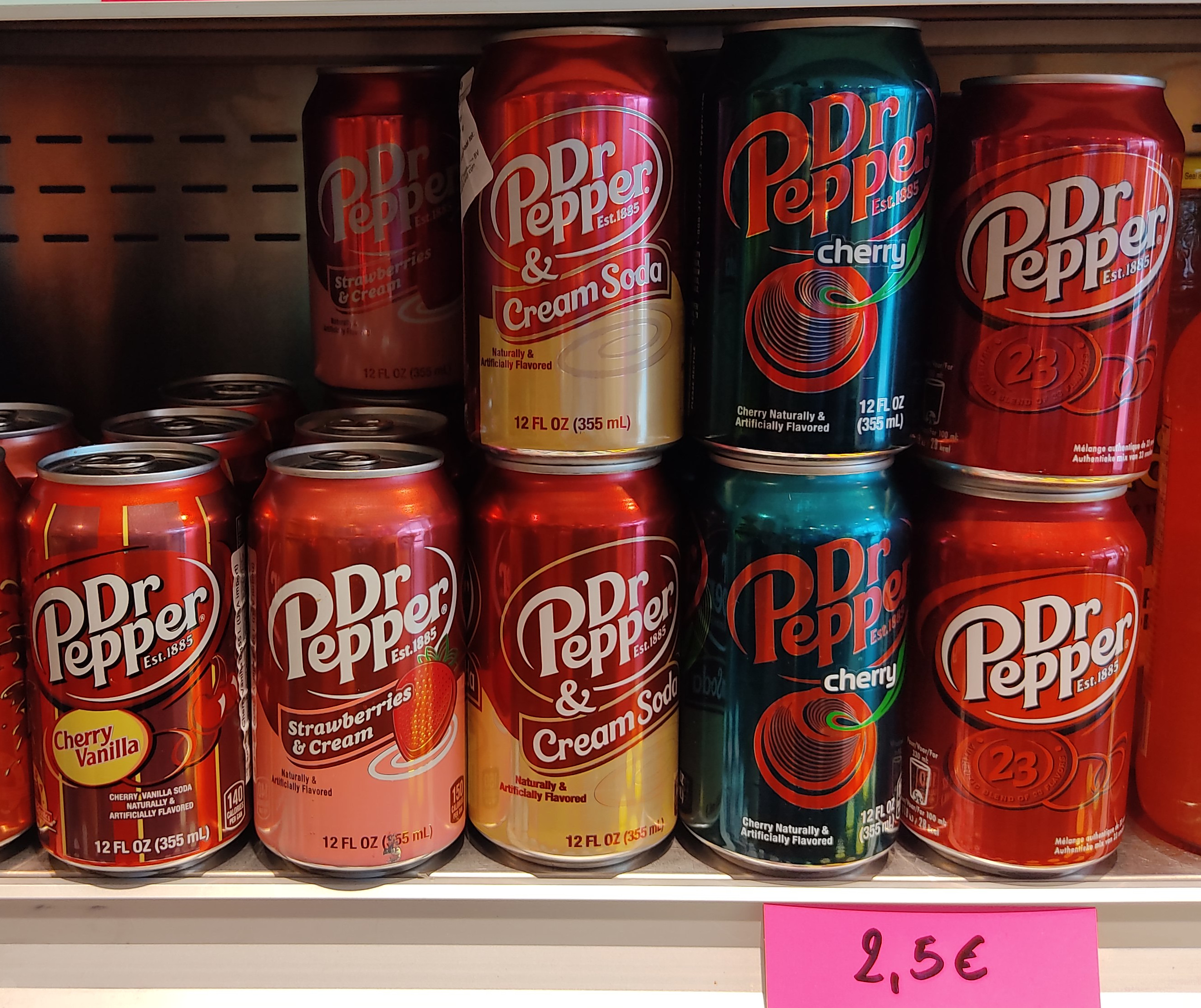 닥터페퍼 | 독일 | 2006년부터 크롬바허 브라우어리에서 생산하는 독일 닥터페퍼는 원래 영국 버전과 유사한 레시피를 사용했다. 마찬가지로 아스파탐과 아세설팜 칼륨으로 레시피가 변경되었지만, 설탕 함량은 영국보다 더 많이 감소했다.[3] | |