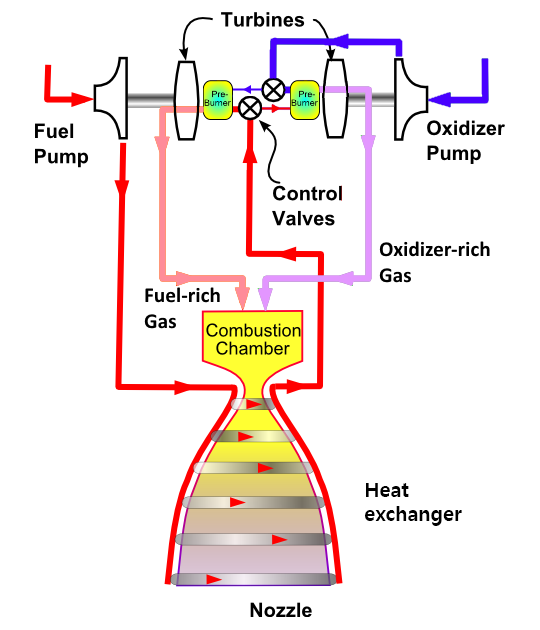 - 전 유량(Full-flow) 단계식 연소: 연료와 산화제 모두를 각각의 예연소기에서 연소시킨 후, 각각의 터보펌프를 구동하고 주 연소실로 보낸다.