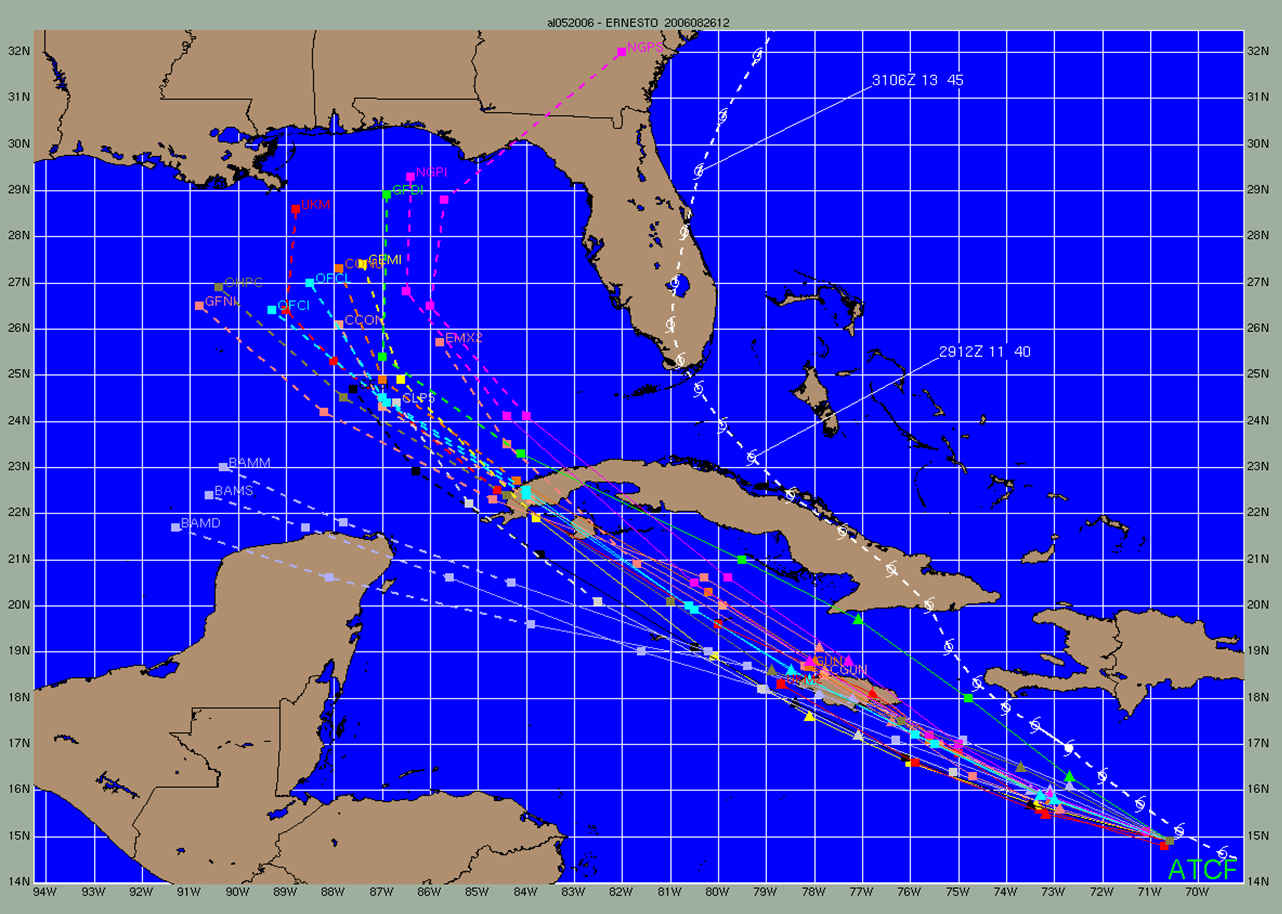국립 허리케인 센터의 제한 구역 모델 내 허리케인 어네스토 (2006년)의 모델 확산