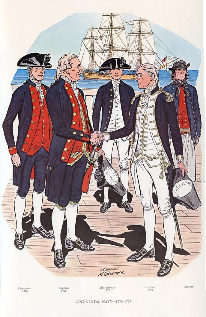 해군 위원회는 1776년 9월 5일에 다음과 같은 제복 지침을 발표했다.[38]직책 제복 상세 대위 파란색 옷감에 붉은 옷깃, 슬래시 커프, 스탠드 칼라, 평평한 노란색 단추, 파란색 반바지, 좁은 레이스가 달린 붉은 조끼 중위 파란색 옷감에 붉은 옷깃, 둥근 커프는 붉은색, 스탠드 칼라, 평평한 노란색 단추, 파란색 반바지, 붉은 조끼, 평범한 스타일 원사 파란색 옷감에 옷깃, 둥근 커프, 파란색 반바지, 붉은 조끼 사관후보생 파란색 옷감에 옷깃, 둥근 커프는 붉은색, 스탠드 칼라는 단추와 단추 구멍이 붉은색, 파란색 반바지, 붉은 조끼