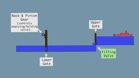 개봉은 주요 중심지로 성장하여 나중에 송(宋)나라(960~1279)의 수도가 되었다. 당나라와 송나라의 국제 해항(가장 큰 곳은 각각 광저우와 천주였다)과 해상 무역이 상인들에게 큰 부를 가져다주었지만, 중국 내부의 대운하가 가장 많은 경제 활동과 상업적 이익을 가져왔다.[22] 송나라 이전 시대에는 바지선이 대운하의 산양운도(山陽運道) 구간에서 이중 활주로를 통과할 때 종종 충돌하고 난파되었으며, 대부분의 경우 현지 산적들에게 세금 곡물을 강탈당했다.[23] 이에 따라 회남(淮南)의 운송 부판관 조위월이 984년에 물레방아 수문으로 알려진 이중 문 시스템을 발명했다.[24] 이를 통해 배는 적절한 수위로 물을 배수하는 동안 문이 있는 공간 안에서 대기할 수 있었고, 중국인들은 배를 더욱 보호하기 위해 공간 위에 지붕이 있는 창고를 건설하기도 했다.[24]