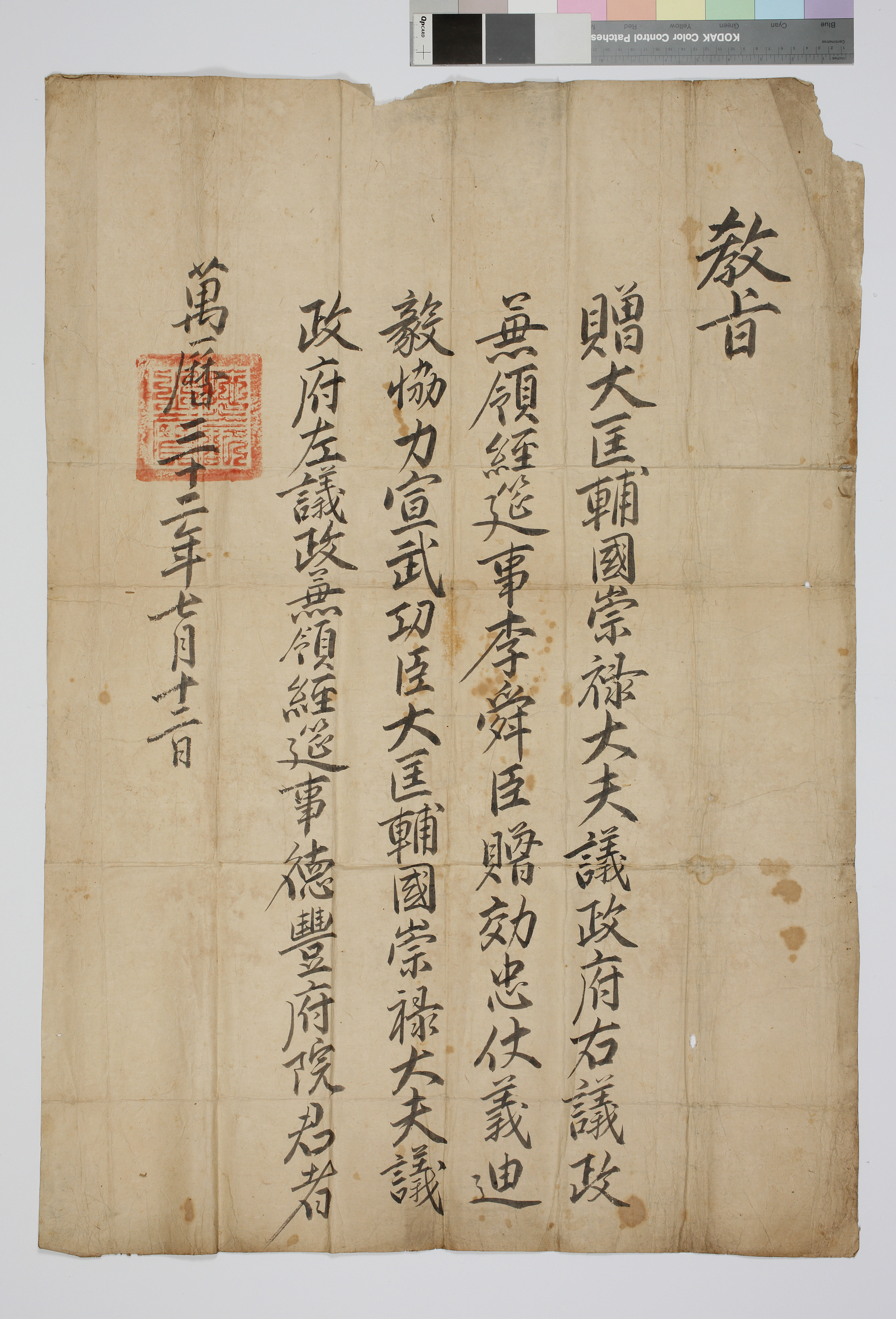 이순신 관련 유물(보물 제1564호)은 여러 세부 유물로 구성되어 있으며, 대부분 현충사 및 충무공 이순신 기념관에 소장되어 있다. 이 중 이순신 증직교지(보물 제1564-10호)와 이순신 사패교지(보물 제1564-11호)는 이순신 증직교지, 이순신 사패교지 그림과 같다.