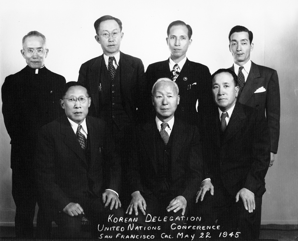 1945년 5월 22일, 샌프란시스코 UN 창립 총회에 한국 대표단으로 참석하려 했으나,[43] 한인 단체 대표들 간 의견 충돌, 미 국무성 앨저 히스의 연립 정부안 수락 종용이 있었다.[43]