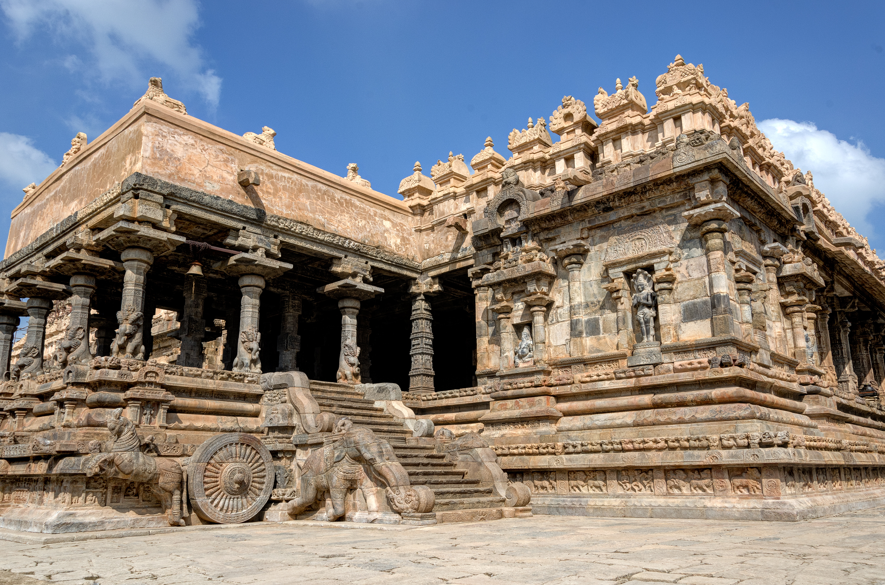 인다라의 흰 코끼리 이름을 딴 이 사원은 촐라 제국 웅장한 사원 건축의 증거이다. 라자라자 1세부터 시작된 여러 세대의 왕들이 건설한 세 개의 위대한 촐라 사원 중 마지막으로, 라자라자 2세가 1150년경에 지었다. 정교하게 조각된 기둥, 화강암으로 만들어진 긴 계단, 말들이 끄는 우아한 전차(돌로 조각됨)가 있는 라자가밤히라 티루만다팜(왕실 안뜰)이 특징이다. 이전 사원보다 더 정교한 솜씨를 볼 수 있으며, 다라수람은 쿰바코남에서 매우 가까운 거리에 있다.
