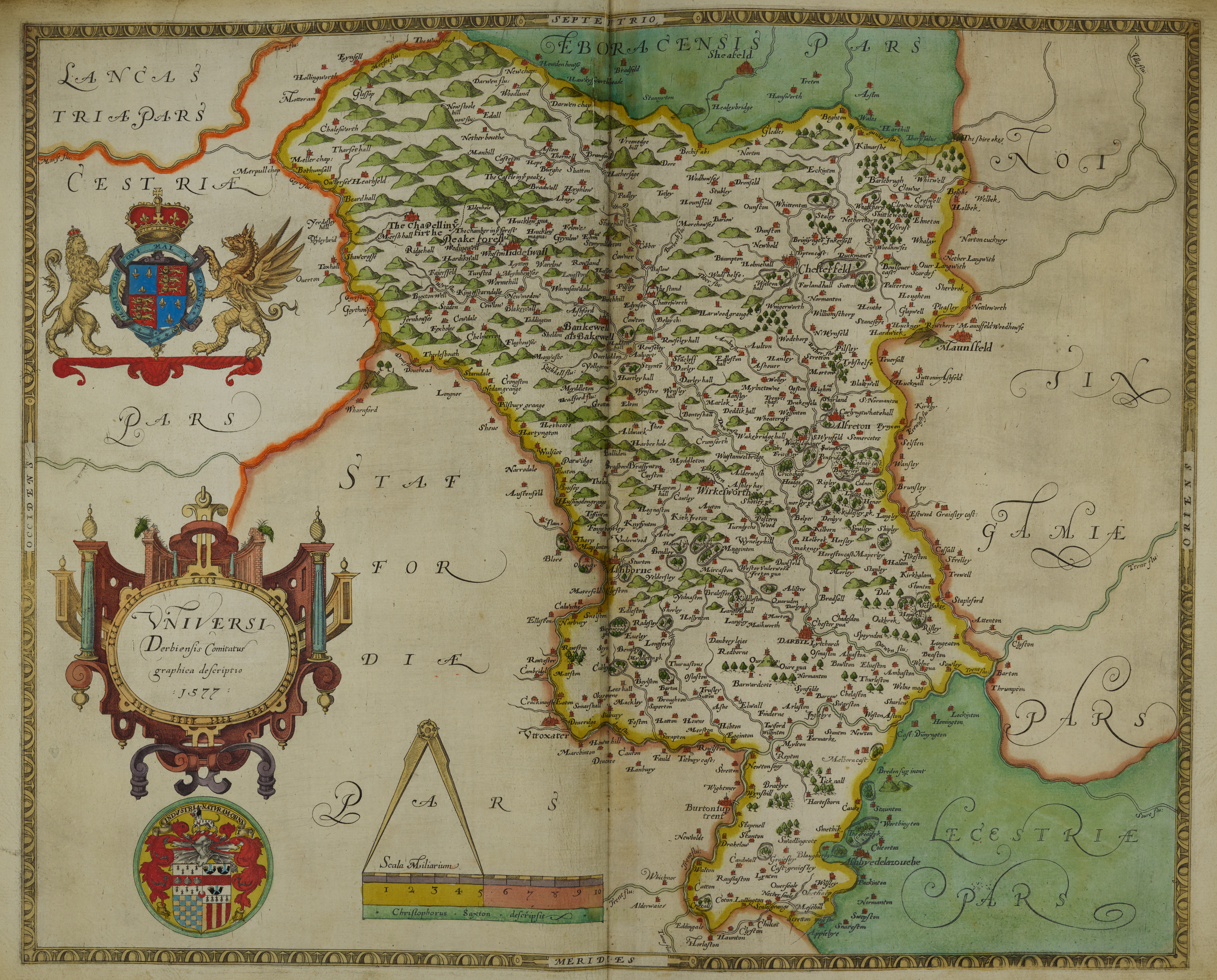 1577년 크리스토퍼 색스턴의 손으로 그린 더비셔 지도