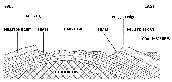 북부 더비셔의 단면도. 서쪽에서 동쪽으로, 동쪽의 젊은 석탄층 암석과 중앙에 노출된 오래된 석회암이 있는 침식된 돔 구조를 보여준다.