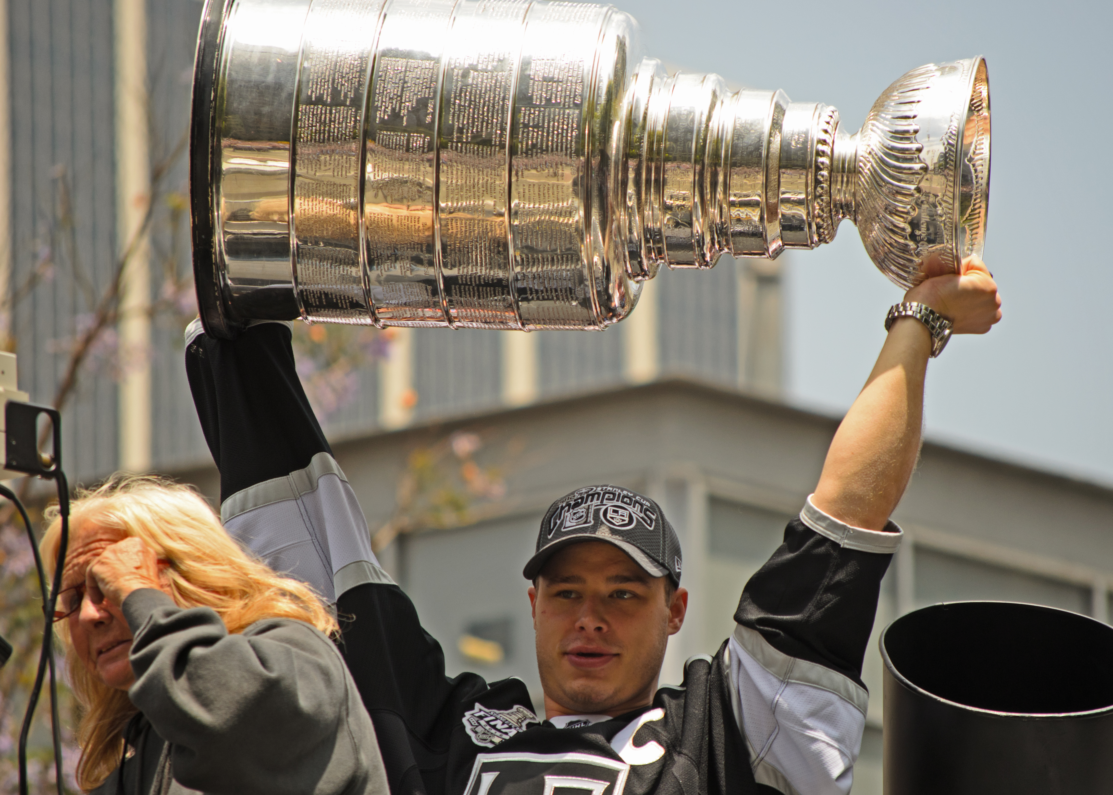 브라운이 킹스의 2012년 챔피언십 퍼레이드에서 스탠리 컵을 들어올리고 있다.