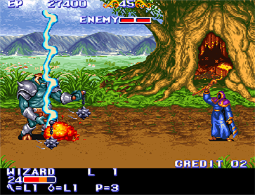 8방향 레버와 2개의 버튼으로 조작한다. 버튼으로 공격, 점프, 마법을 사용할 수 있다.[1]마법은 체력을 조금 소비하지만, 잠시 동안 무적이 된다.[1] 파이터, 클레릭, 드워프는 충돌 직전에 조이스틱을 뒤로 기울여 방패를 사용하여 특정 공격을 막을 수 있다.[1] 두 버튼을 동시에 누르면 캐릭터는 화면 내의 모든 적에게 마법 공격을 가하며(그 강도는 사용된 캐릭터에 따라 다름) 에너지를 잃는다.[1]