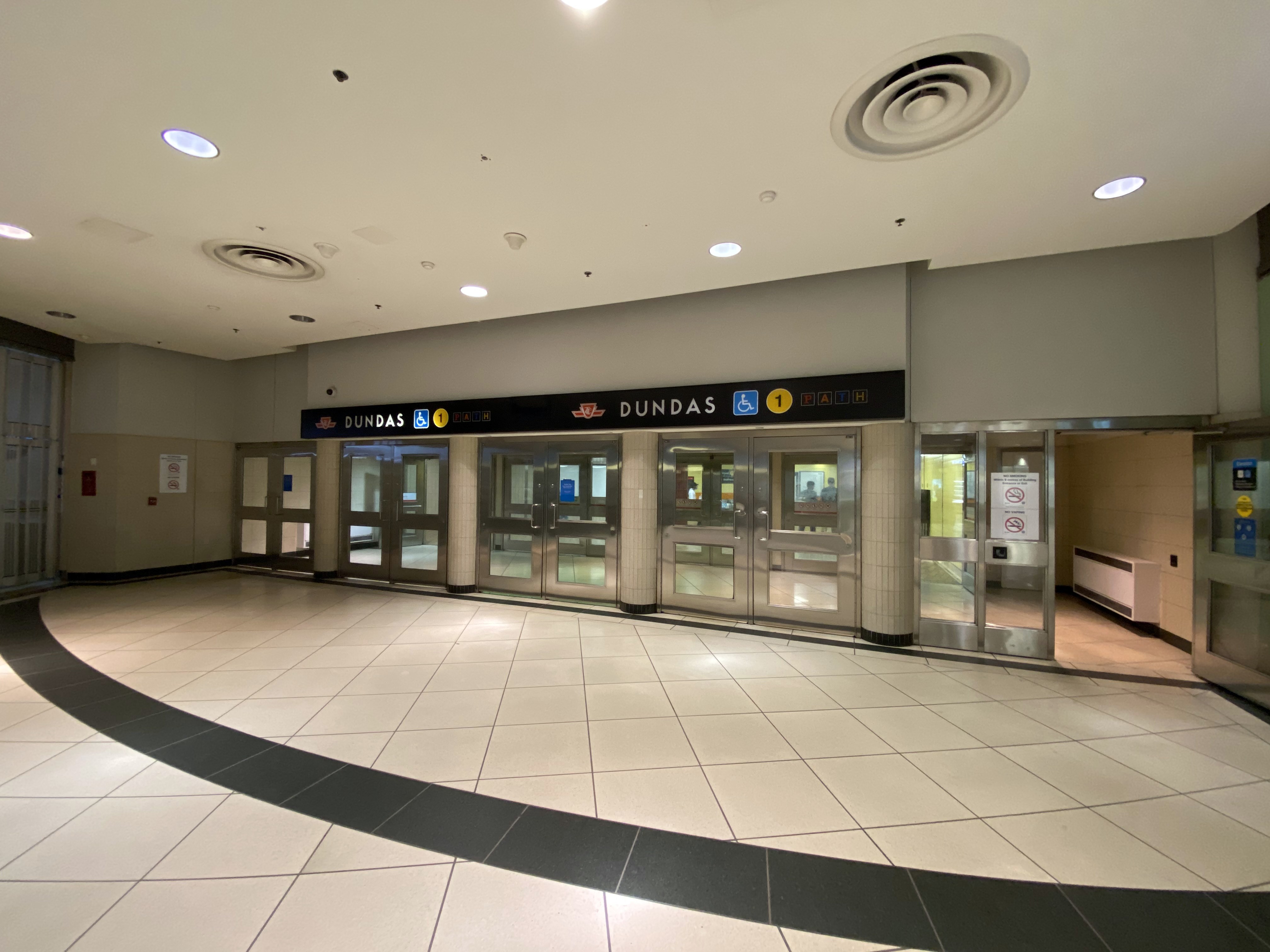 던다스역의 남서쪽 출입구는 토론토 이튼 센터 내부에 위치해 있다. 또한, 던다스역은 토론토 이튼 센터와 지하 통로로 직접 연결되어 있어 편리하게 접근할 수 있다. 이 연결 통로는 토론토의 지하 상가 네트워크인 PATH (Toronto)|PATH영어의 일부이기도 하다. 따라서 던다스역은 대형 쇼핑몰인 토론토 이튼 센터를 방문하기에 가장 가까운 역이다.