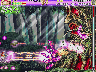 - * 파워 업 상태에서는 공격력이 크게 강화되고, 적의 탄환을 제외한 다른 모든 것(적 캐릭터 등)에 접촉해도 피해를 입지 않는 무적 상태가 된다. 파워 업이 발동되는 순간 화면상의 모든 적탄은 점수 아이템인 대왕관으로 변환된다.