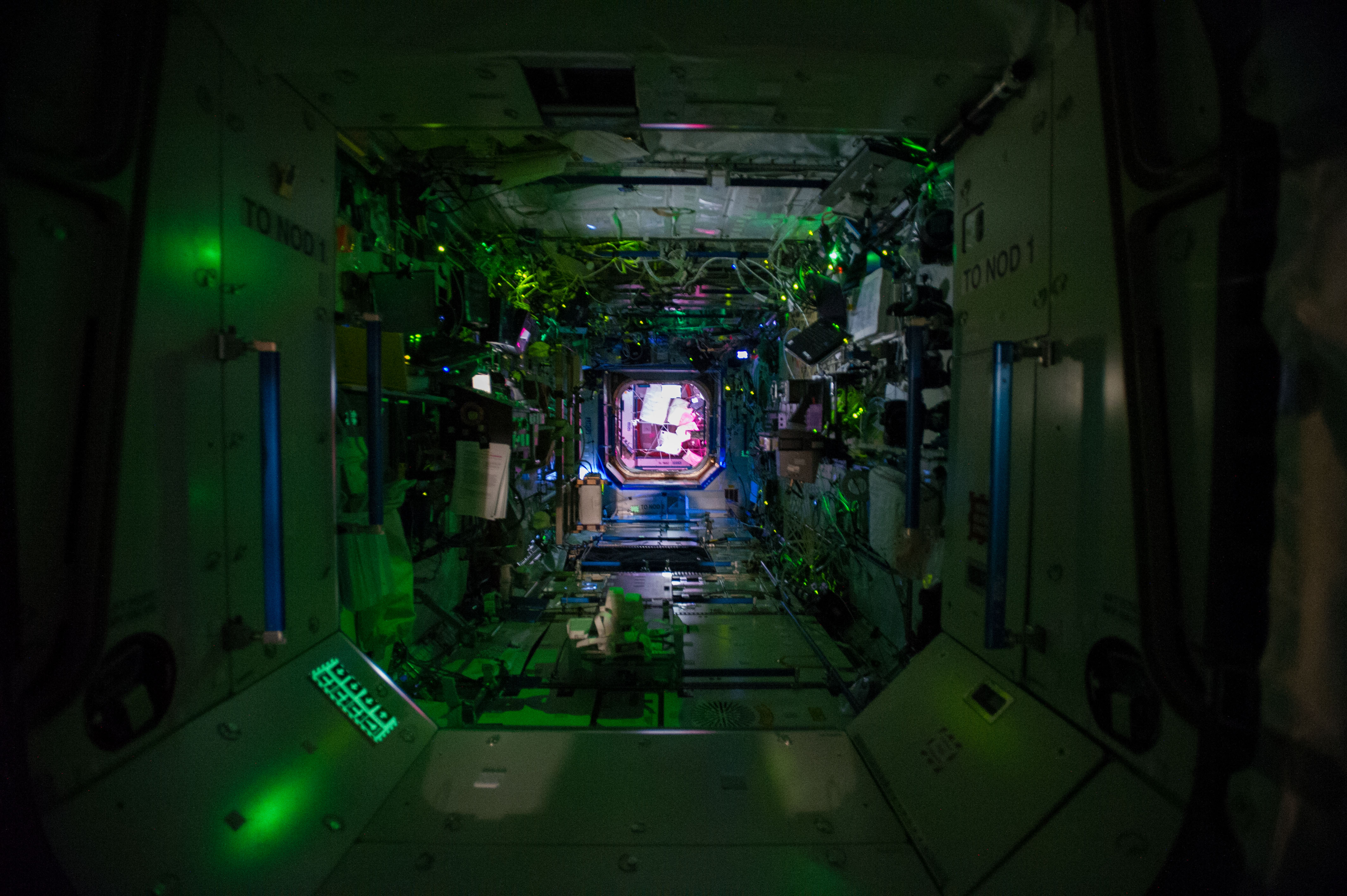 승무원이 잠든 동안 조명이 꺼진 ''데스티니'' 실험실 내부 모습