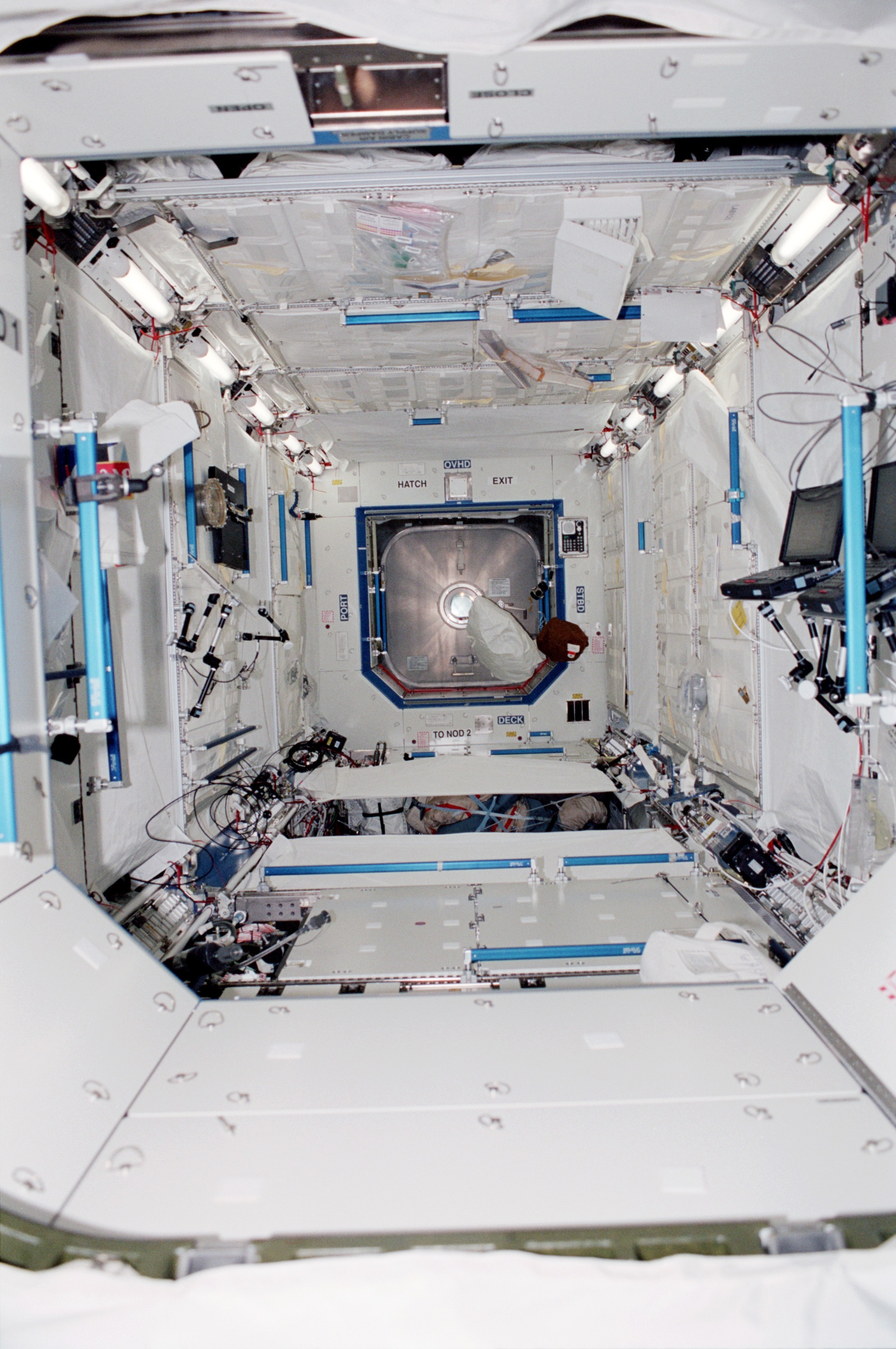연구실 내부에는 랙, 랙 스탠드오프, 그리고 모듈 연결 통로의 점퍼가 있다.[10] 랙은 탈착식 모듈형 장치에 시스템 하드웨어를 보관한다. 스탠드오프는 전기 연결, 컴퓨터용 데이터 관리 시스템 케이블, 에어컨 덕트, 열 제어 튜브 등을 위한 공간을 제공하며, 우주 정거장의 장비 랙을 지원한다.[10] 랙은 각 랙 위치 하단의 스탠드오프에 있는 콘센트와 포트를 통해 스탠드오프의 배관 및 배선과 연결된다. 유니티와 ''데스티니'' 사이의 통로에 있는 점퍼는 두 모듈 사이의 배관과 배선을 연결한다. 또한, 유니티의 능동 공용 결합 메커니즘(ACBM)과 ''데스티니''의 수동 공용 결합 메커니즘(PCBM) 사이에 접지 스트랩이 설치되어 있다.