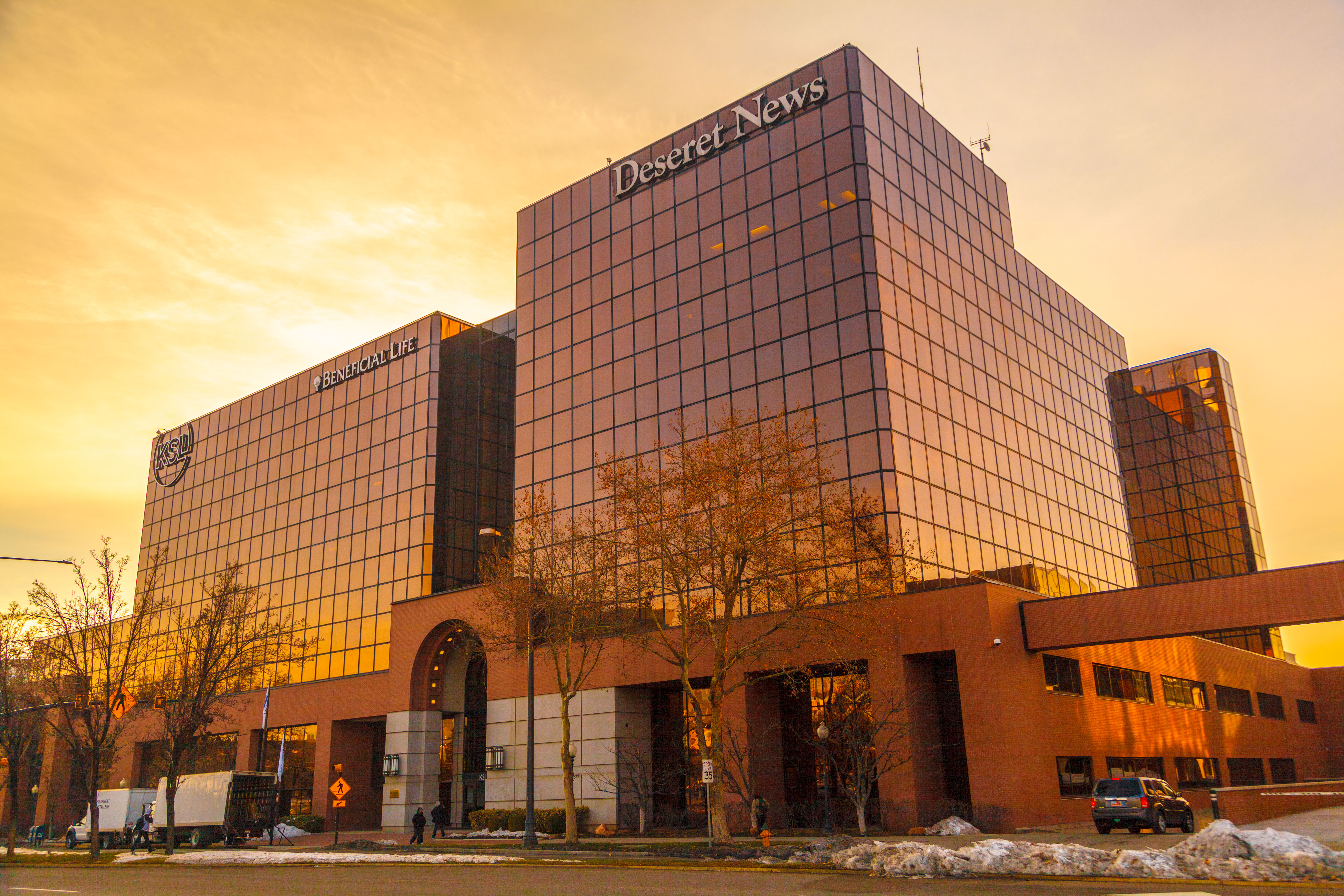 리젠트 스트리트에 있는 ''데저레트 뉴스''의 이전 위치. 신문사 로고가 건물 외관 상단에 새겨져 있었지만 (새 입주자에 의해 채워짐) 건물에 신문사 이미지를 부여했다.