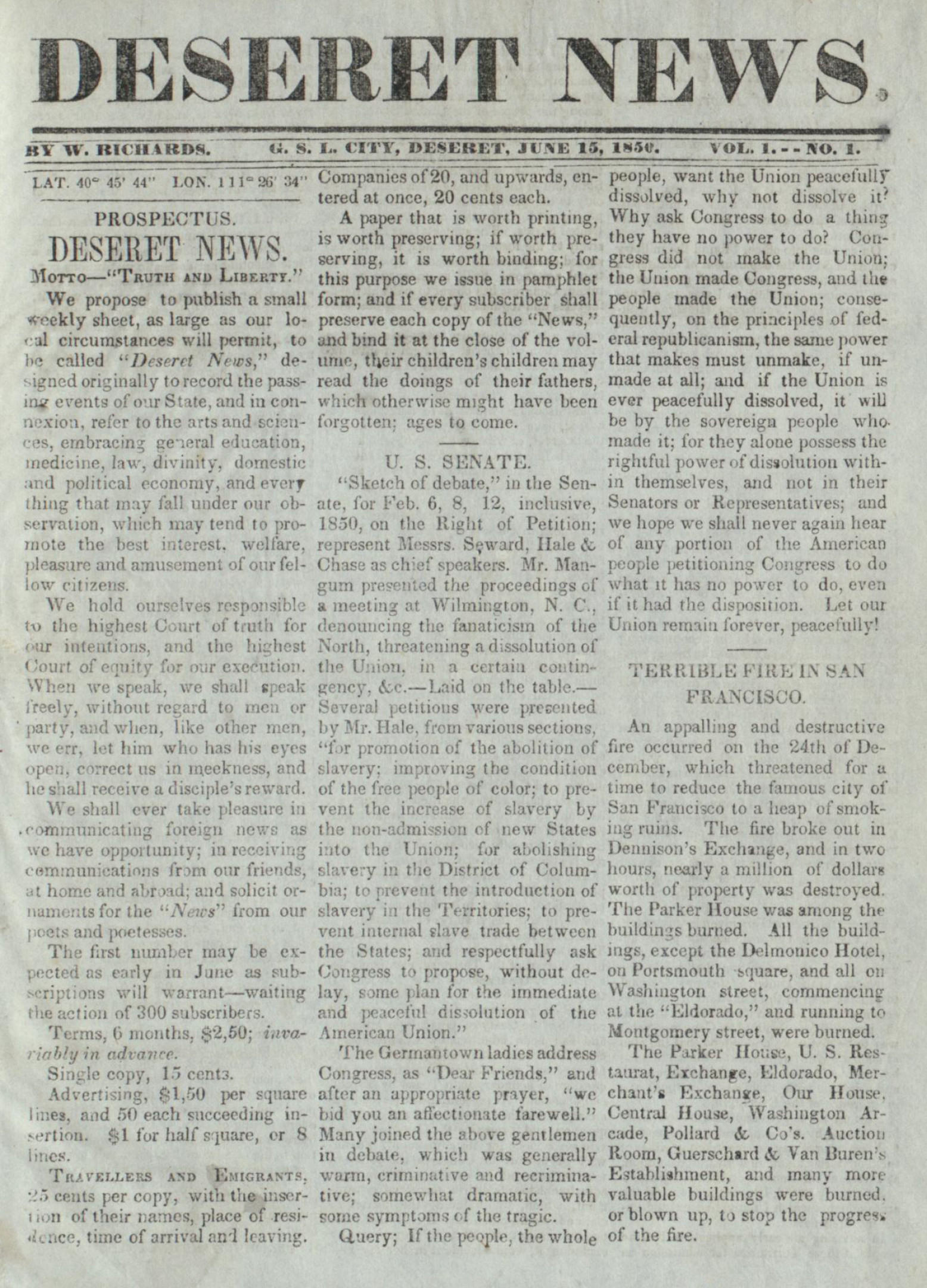 1850년 6월 15일, 최초의 《데저레트 뉴스》가 8페이지 분량으로 발행되었다. 이 첫 번째 호에는 편집자 윌라드 리차드가 작성한 신문의 기획안, 미국 의회 소식, 그리고 6개월 전에 발생한 샌프란시스코 1849년 크리스마스 이브 화재 보고서가 실렸다.[12] 신문 이름은 데저레트 주의 목소리가 되기 위해 《데저레트 뉴스》로 정해졌으며, 모토는 "진실과 자유"였다. 처음에는 매주 토요일에 발행되었고, 독자들이 신문을 묶어 책으로 만들 수 있도록 "소책자 형식"으로 나왔다.[13] 구독료는 6개월에 2.5달러였다.