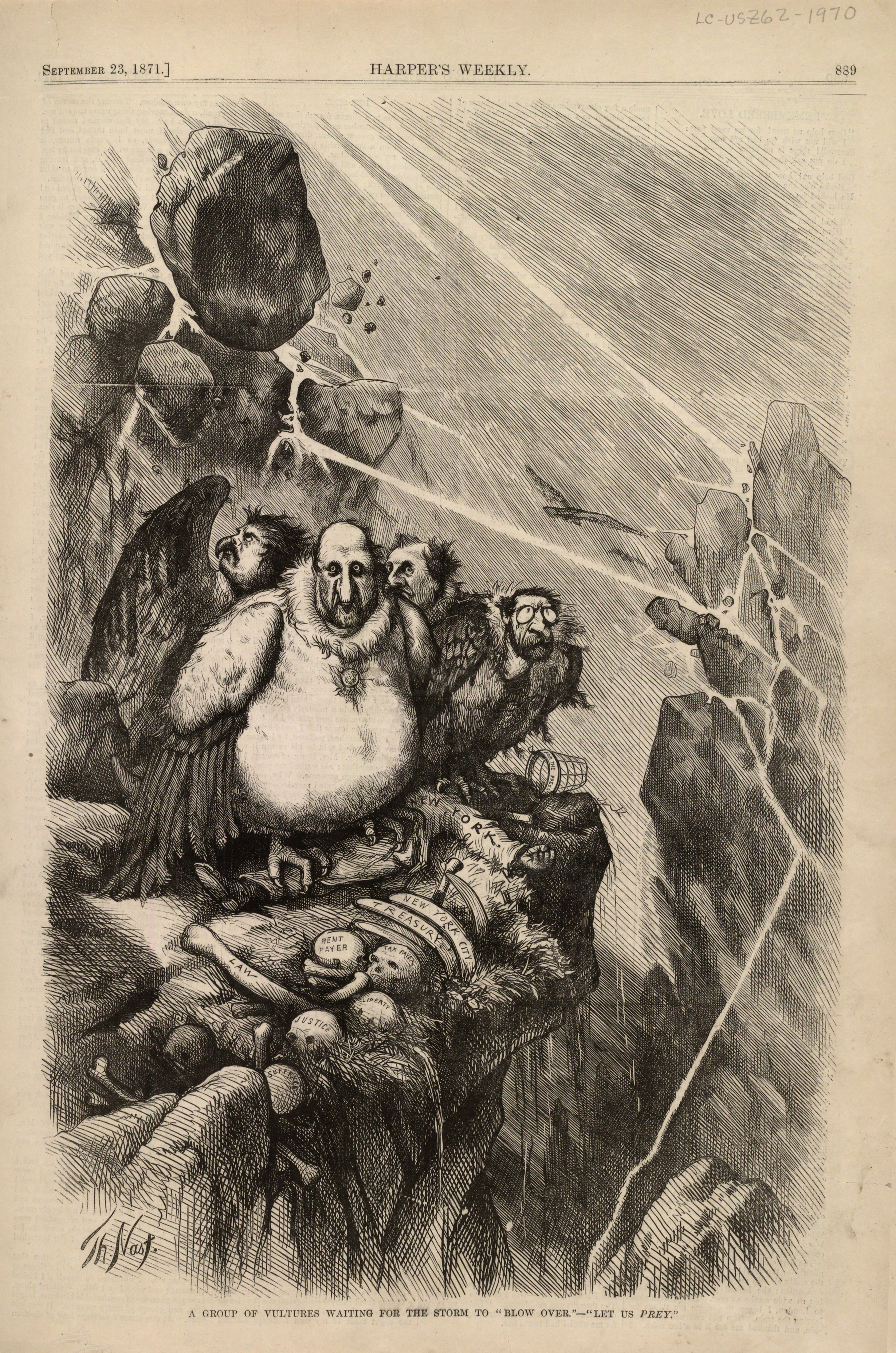 1871년 토마스 나스트가 그린, ''하퍼스 위클리''에 실린 뉴욕의 보스 트위드와 다른 태머니 홀 인물들의 부패를 비난하는 만화 ''폭풍이 "지나가기를" 기다리는 독수리 무리 – "우리를 노리자,"''