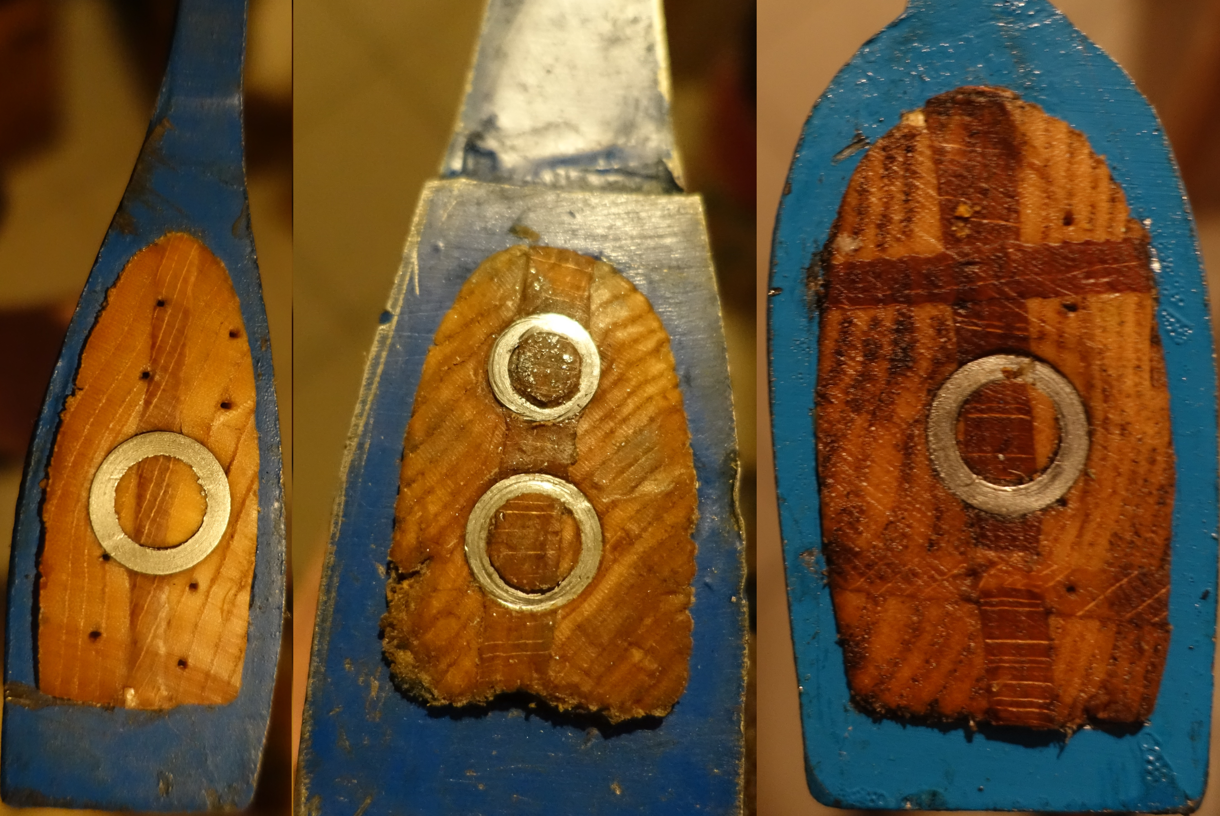- 선반 망치(래스 망치, 래싱 망치, 래싱 도끼): 나무 래스를 자르고 못을 박는 데 사용되는 도구. 한쪽에는 작은 도끼 날(못을 뽑는 데 사용되는 작은 측면 홈)이, 다른 쪽에는 망치 머리가 있다.[18]