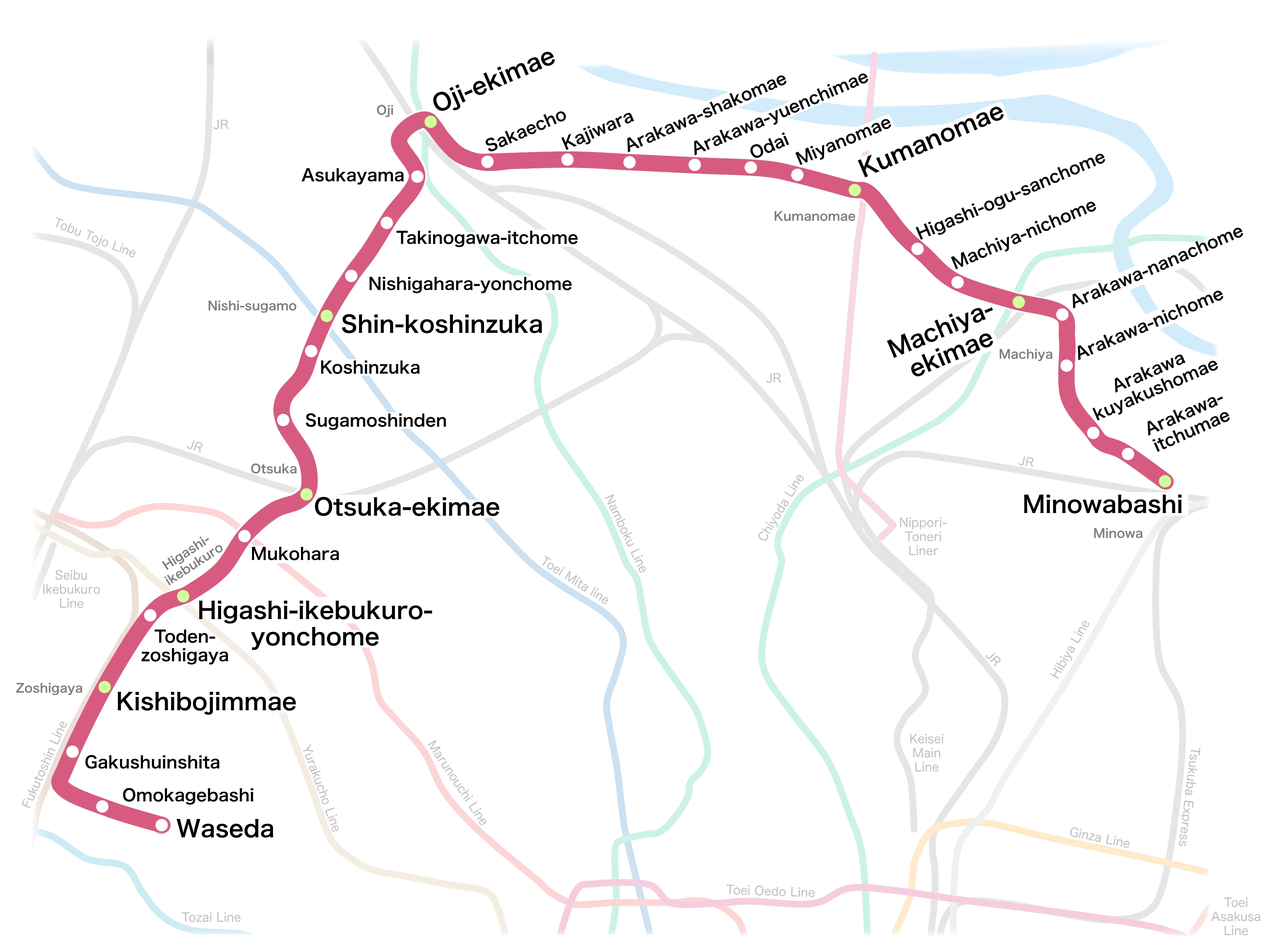 야마노테선(오쓰카역:JY 12) SA 24무코하라0.59.4 오쓰카다이 공원SA 25히가시이케부쿠로 4초메0.610.0도쿄 메트로:-- 유라쿠초선히가시이케부쿠로역:Y-10)선샤인 시티, IKE·SUNPARKSA 26도덴 조시가야0.210.2 조시가야 영원, 도요시마구청SA 27기시모진마에0.510.7도쿄 메트로:-- 부도심선(조시가야역:F-10)호묘지 기시모진당, 나미키 하우스SA 28가쿠슈인시타0.511.2 가쿠슈인 대학, 긴조인 메지로 부동존SA 29오모카게바시0.511.7 간센엔 공원신주쿠구SA 30와세다0.512.2 와세다 대학, 연극 박물관