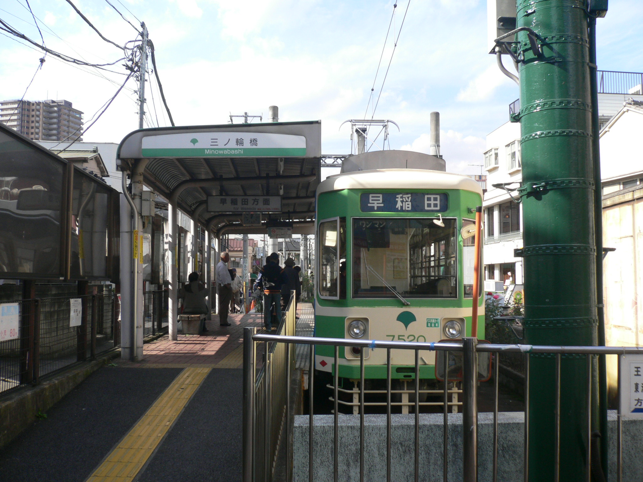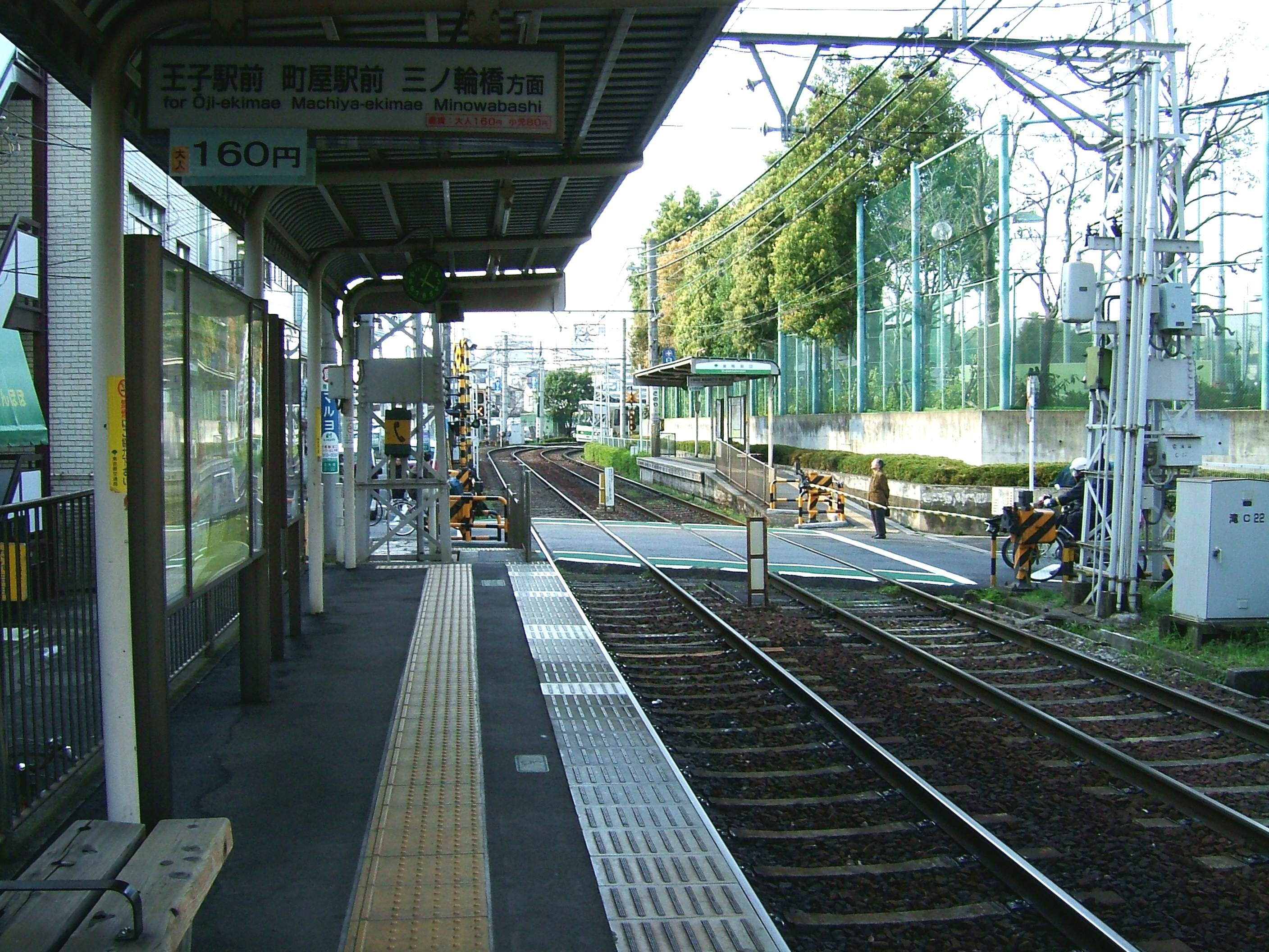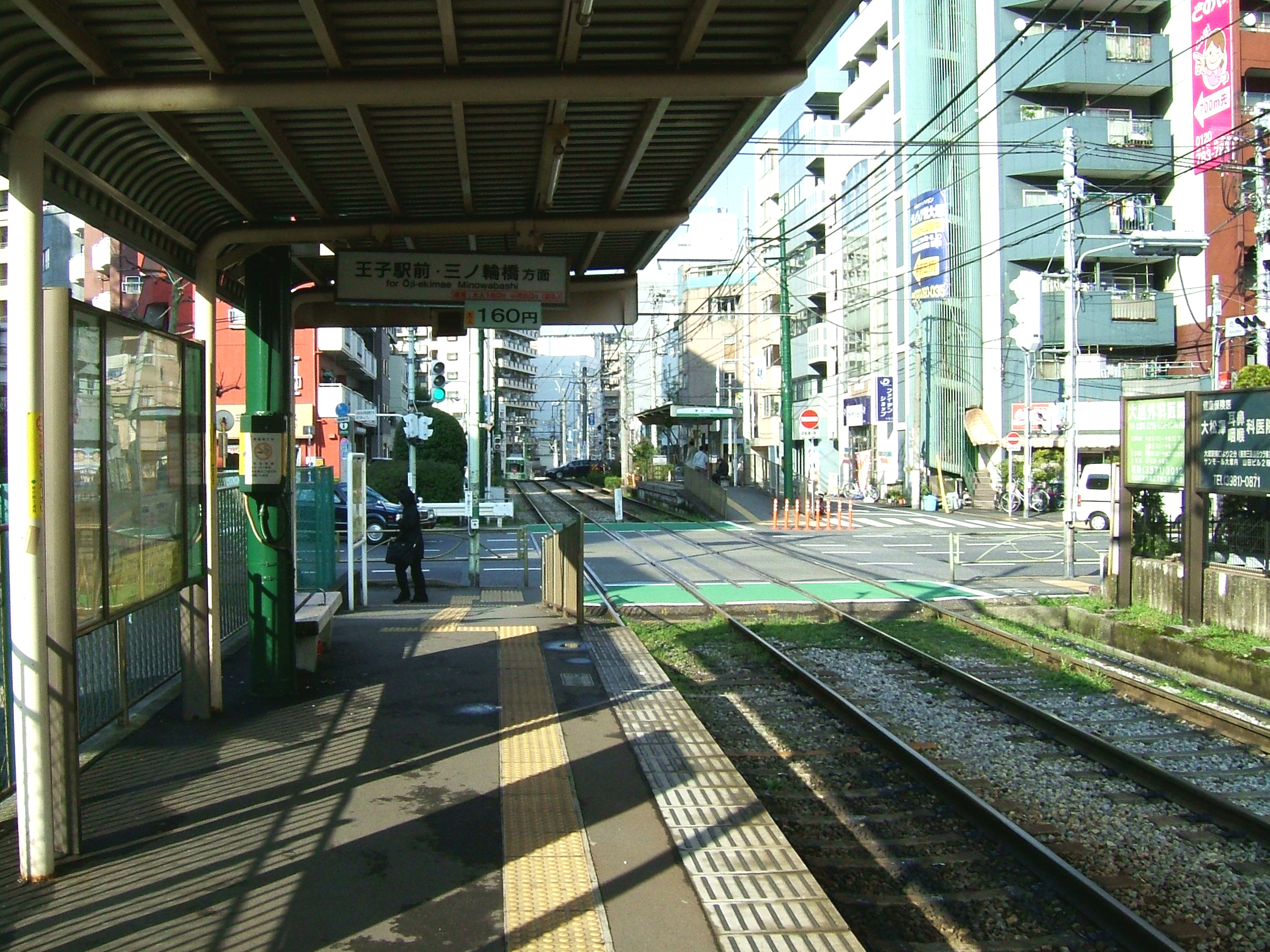 도쿄 지하철 히비야 선 미노와 역에서 닛코 가도 북쪽으로 3분 정도 걸으면 「우메자와 사진관」빌딩이 보인다. 이 빌딩은 구 「오지 전기 궤도」본사 빌딩으로, 음식점 등이 있는 빌딩 1층의 통로를 빠져 나가면 쇼와 30-40년대(1950년대 중반~1960년대 중반)를 생각나게 하는 상가 안에 기점인 미노와바시 정류소가 있다. 당초에는 우메자와 사진관 빌딩 위치에 정류소가 있었던 것으로 보인다.