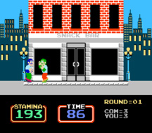 게임은 "5라운드 중 3라운드" 형식으로 진행되며,[5] 각 라운드 시작 시 두 격투가는 200의 스태미나를 가진다.[5] 스태미나가 모두 소진되면 약한 펀치에도 다운될 정도로 취약해진다. 상대를 여러 번 다운시켜 화면 끝으로 밀어내면 해당 라운드에서 승리하고, 다음 라운드는 옆 블록으로 이동하여 진행된다.[7] 총 3라운드를 먼저 이기면 상대가 하수구 뚜껑에 빠지며 최종 승리하게 되고, 창문에서 여자가 색종이 조각을 뿌리며 축하해준다.[7] 각 라운드는 99초의 시간 제한이 있으며, 시간이 다 되면 경찰이 나타나 화면 가장자리에 가까운 플레이어를 체포하고 남은 플레이어가 라운드 승자가 된다.[6] 게임 중에는 방해 요소도 등장한다.[15][6] (자세한 내용은 #방해 요소 참조)