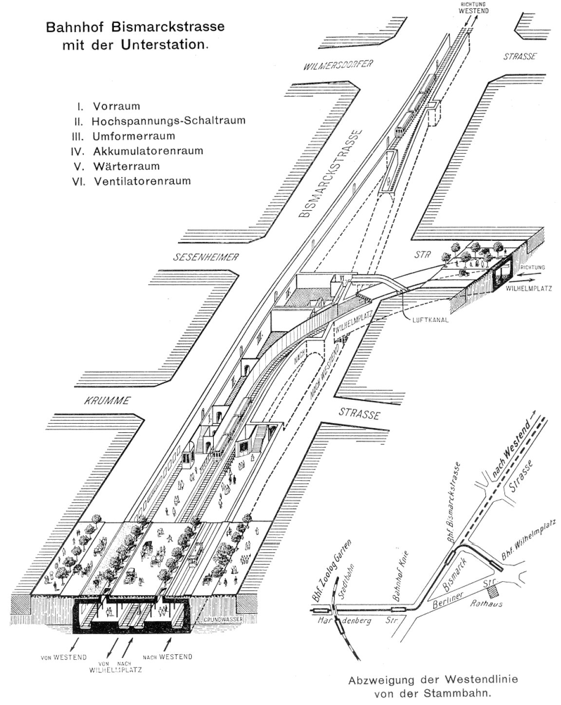 빌헬름플라츠(현재 리하르트-바그너-플라츠) 역이 서쪽 종착역으로 운영되었다. 건축가 알프레드 그레난더는 1908년 3월 29일에 개통된 베스트엔트의 라이히스칸츨러플라츠(현재 테오도어-호이스-플라츠)로의 향후 분기를 고려하여 독일 최초의 4개 트랙 U-Bahn 역을 설계했다.
